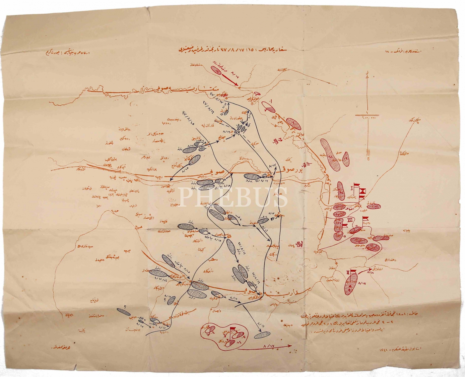 Sakarya Muharebesi esnasında iki tarafın vaziyetini gösterir Osmanlıca harita, İstanbul Matbaa-i Askeriye, 1341, 41x51 cm