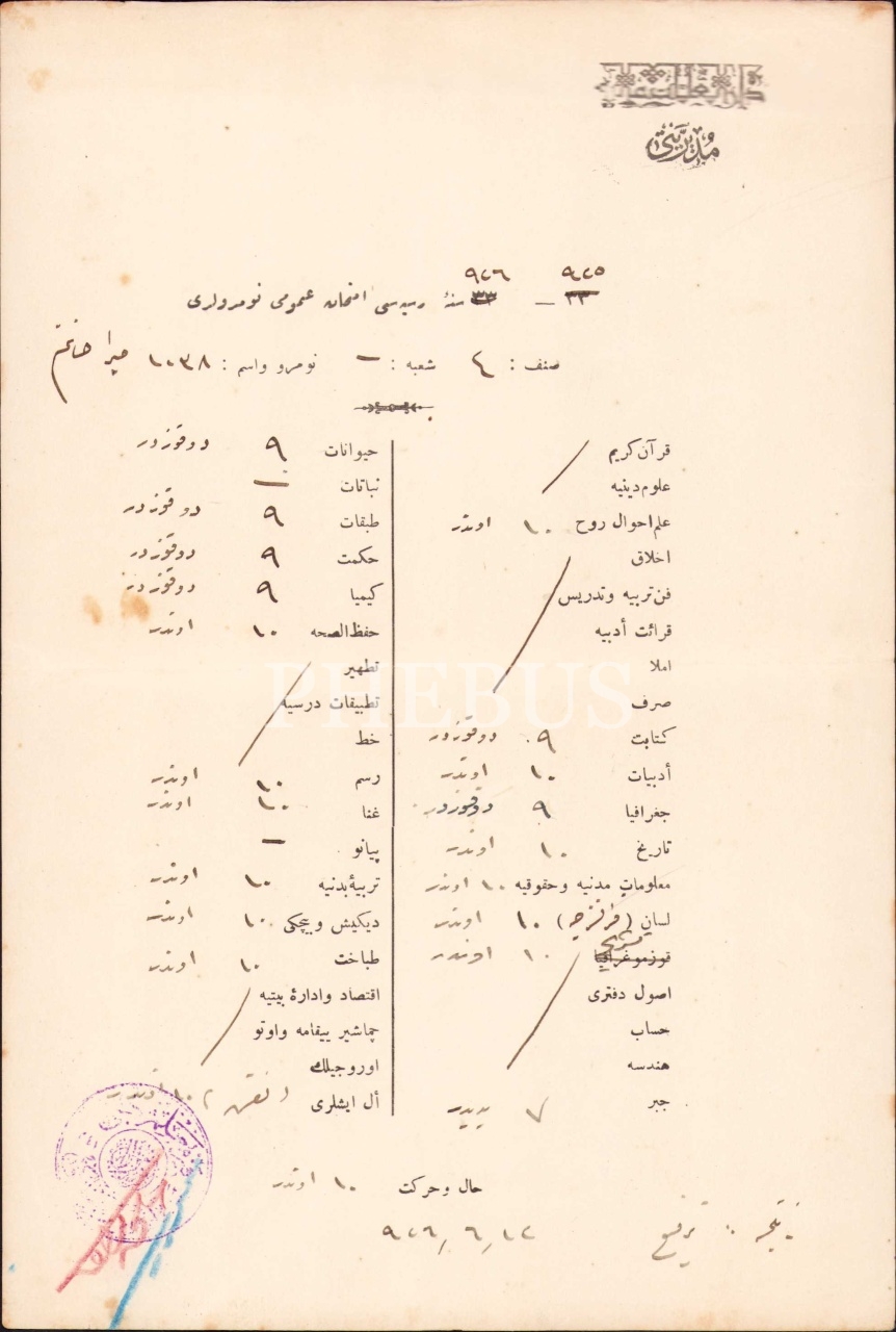 Daru'l-Muallimat imtihan sonuçlarını gösterir karne, 1926, 16x24 cm