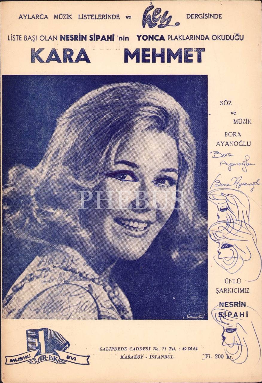 Nesrin Sipahi'nin seslendirdiği, söz ve müziğin Bora Ayanoğlu'na ait olduğu Kara Mehmet şarkı notası, 4 sayfa, 16x24 cm