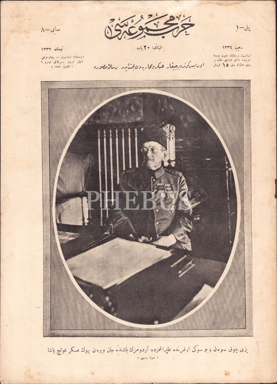 Osmanlıca Harb Mecmuası, Nisan 1332, Kapak: Bizi Çok Seven ve Bu Sevgi Uğrunda Toprağımızda Ordumuzun Başında Can Veren Büyük Asker Goliç Paşa [son resmi], 16 sayfa, 23x33 cm