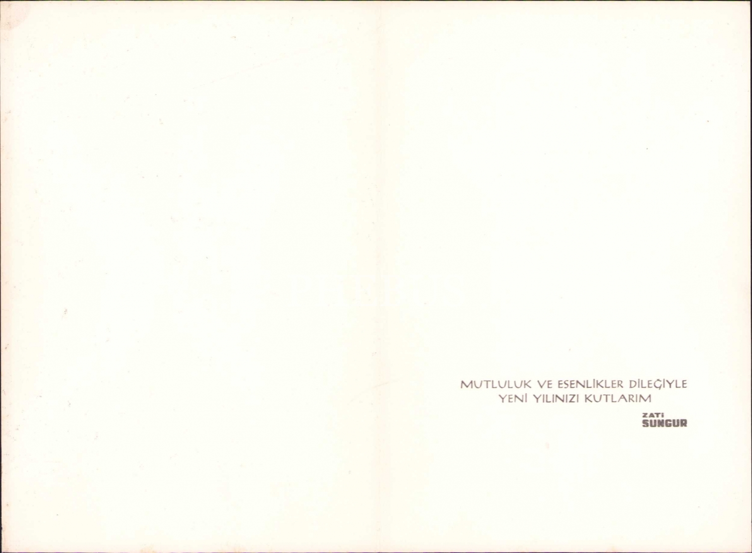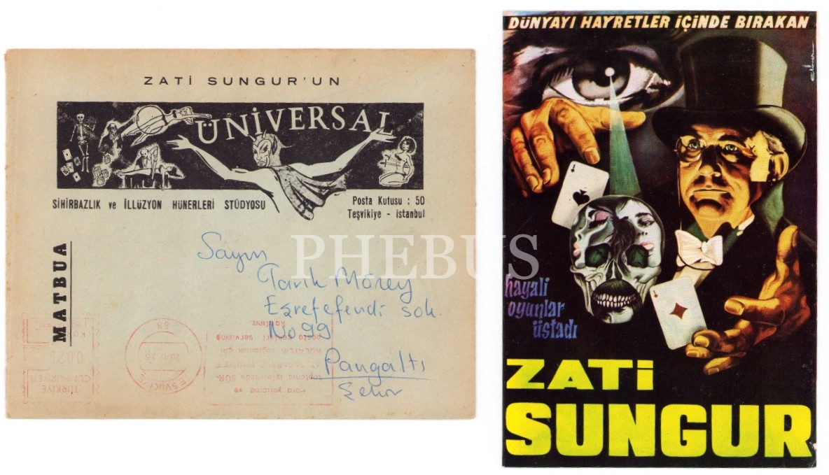 Zati Sungur Universal Sihirbazlık ve İllüzyon Stüdyosu antetli zarf ve yeni yıl tebrik kartı, 15x11 cm