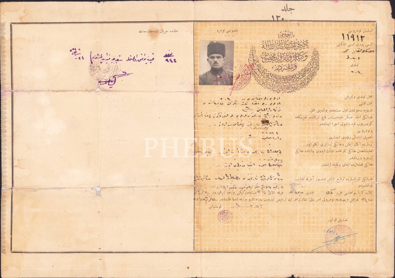 Osmanlıca İkinci Sınıf İhtiyat Zabıtı ve Vekiller ve Namzedlerine Mahsus Vesikadır, Ali Kemal Efendi Oğlu Mehmed - Isparta, tamirli, 40x27 cm