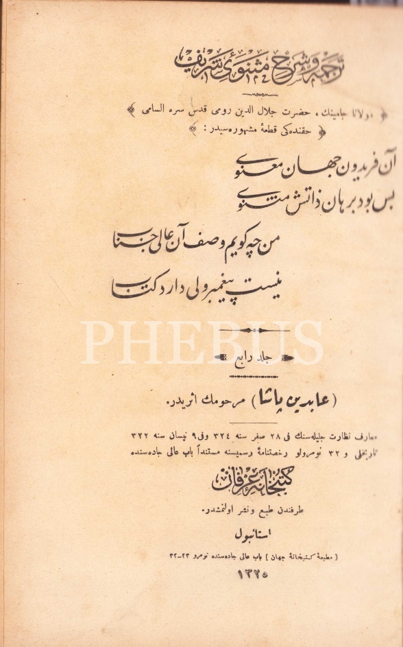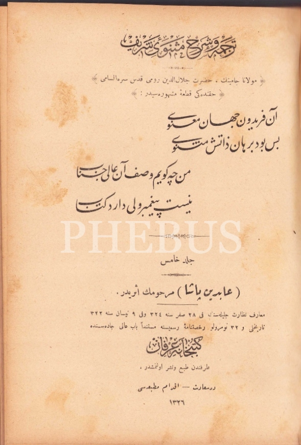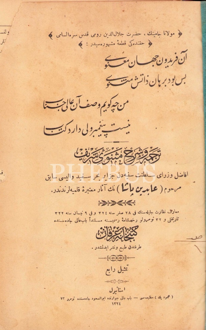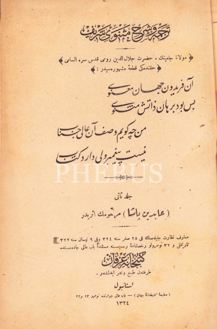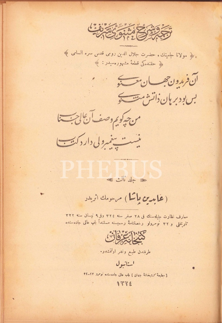 Osmanlıca Tercüme ve Şerh-i Mesnevi-i Şerif [5 cilt iki kitapta], Mevlana Celaleddin-i Rumi, Çeviren: Abidin Paşa, Mahmud Bey Matbaası, İstanbul 1924 - 1925, toplamda 1430 sayfa, 16x24 cm