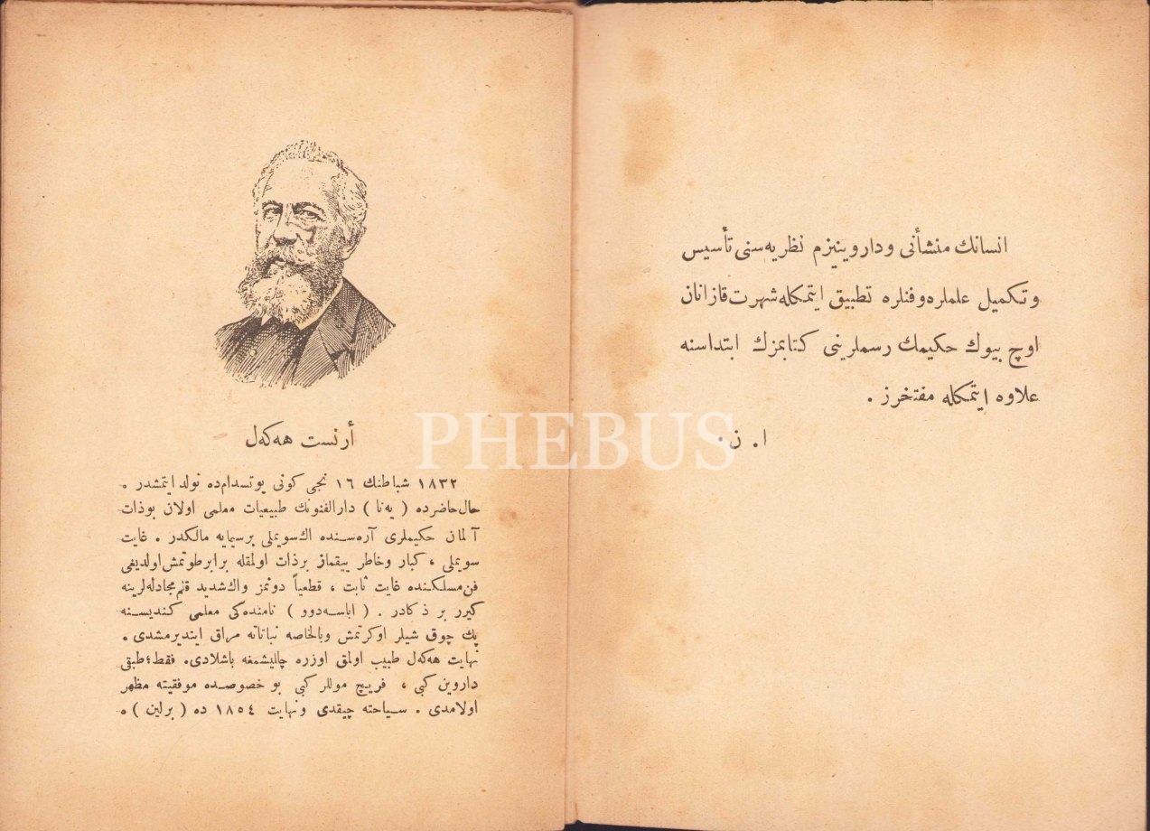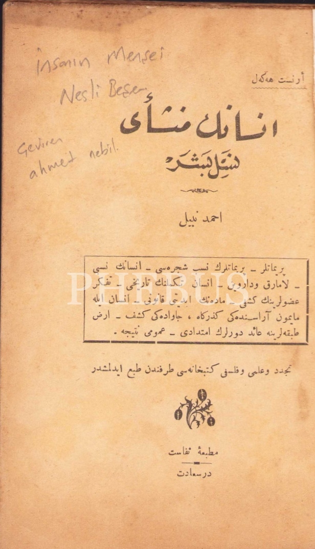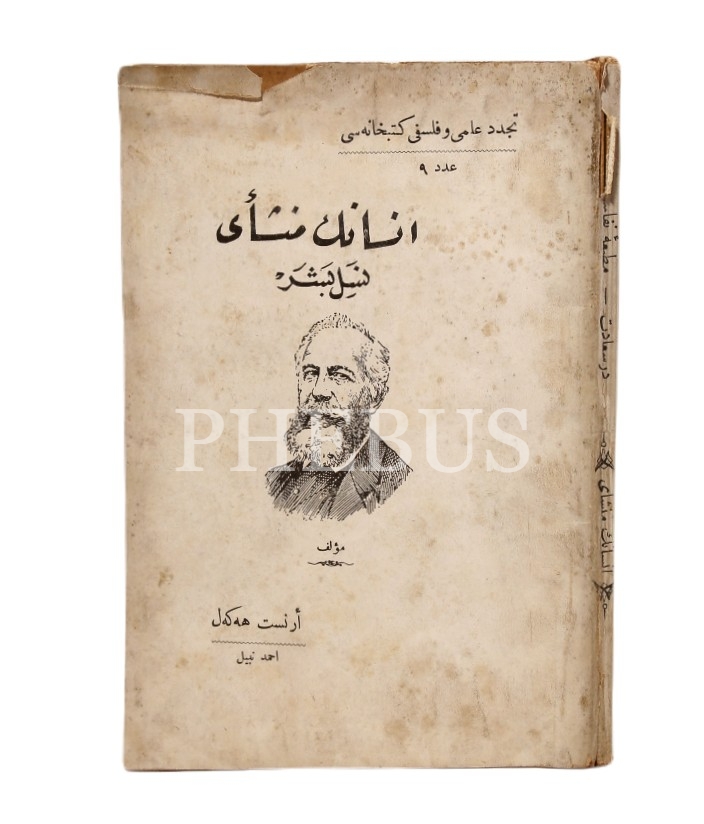 Osmanlıca İnsanın Menşei Nesl-i Beşer, Ernest Heinrich Haeckel, Çeviren Buharalı Ahmed Nebil, Matbaa-i Nefaset, Dersaadet 1911, sırtı haliyle, 96 sayfa, 11x16 cm, ÖZEGE; 9221