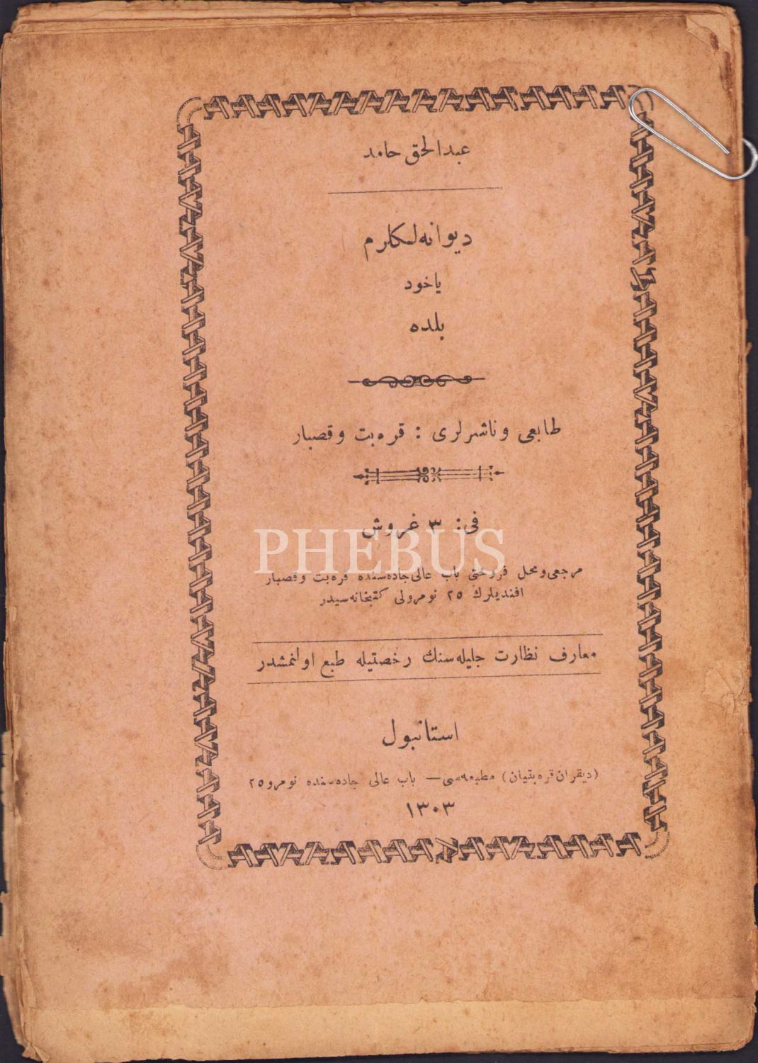 Osmanlıca Divaneliklerim yahud Belde, Abdülhak Hamid, Dikran Karabetyan Matbaası, İstanbul 1303, 44 syf., 13x18 cm