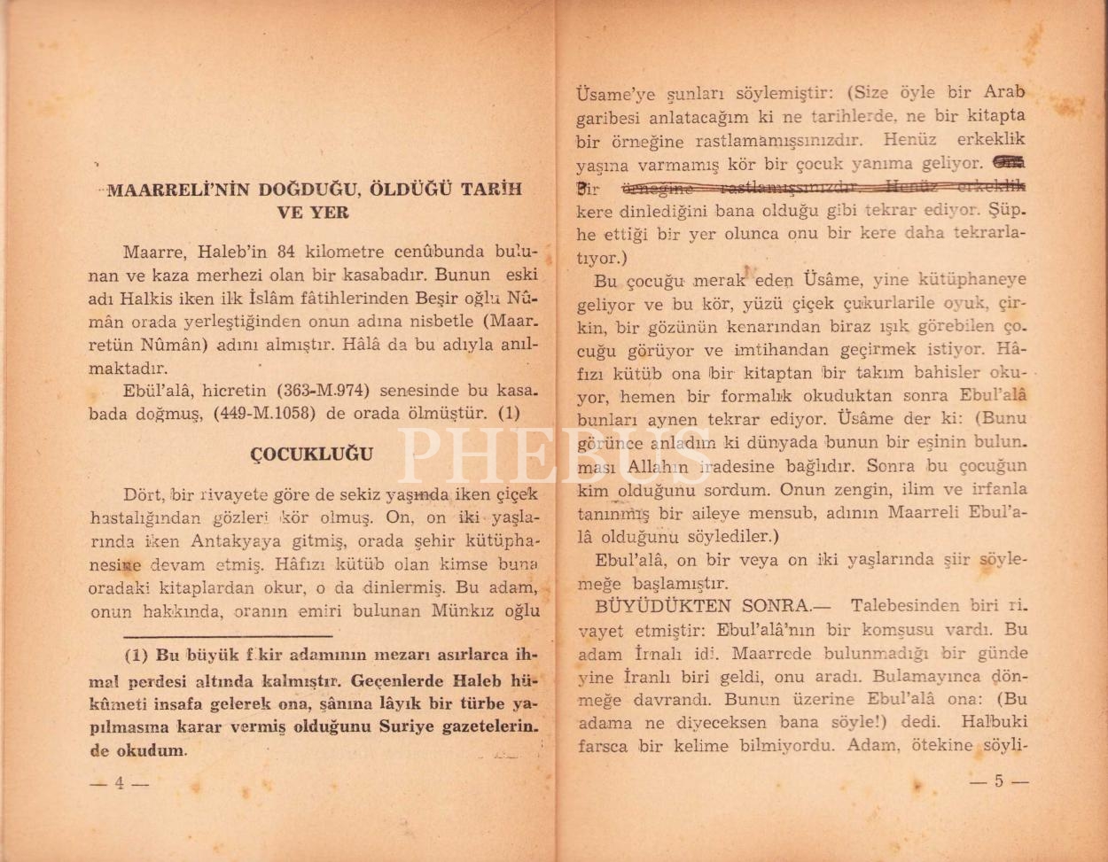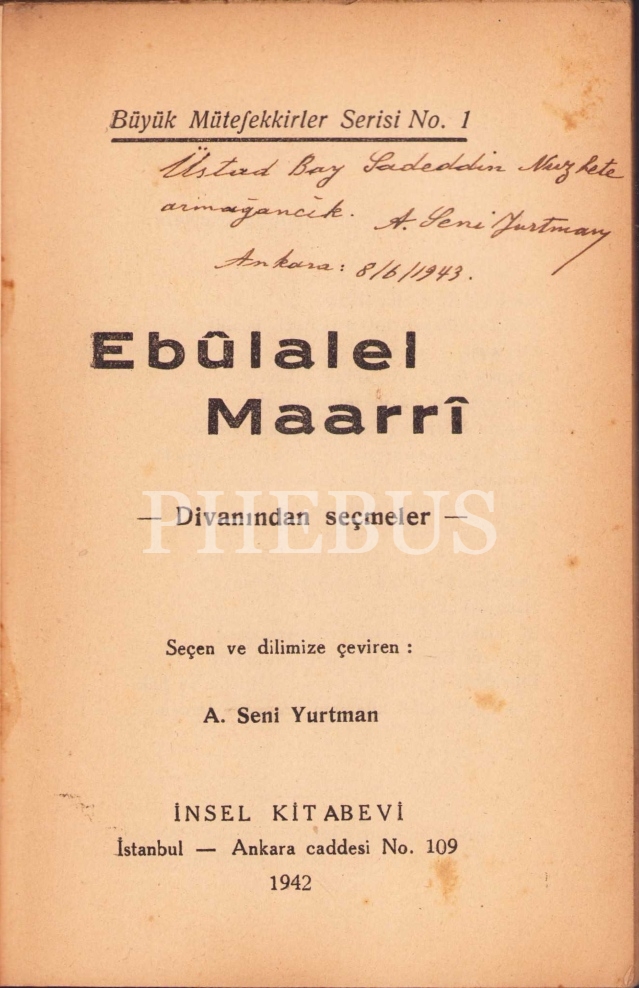 Maarri -Divanından Seçmeler-, çeviren A. Seni Yurtman, İnsel Kitabevi, İstanbul 1942, 96 syf., 12x17 cm