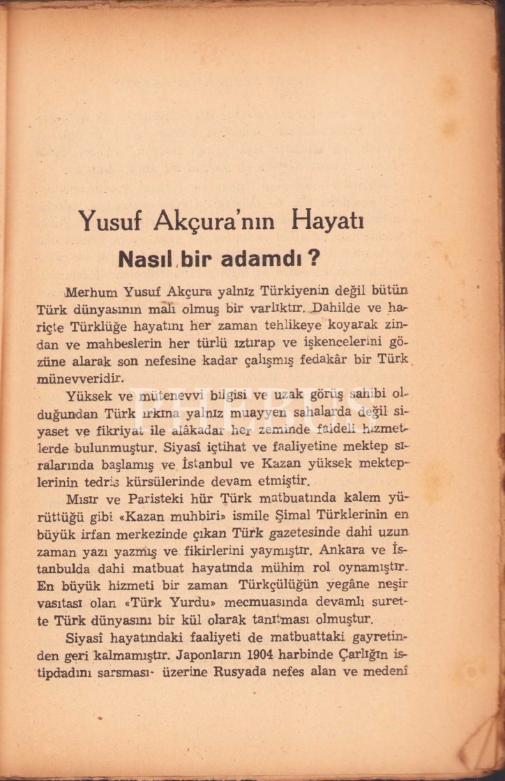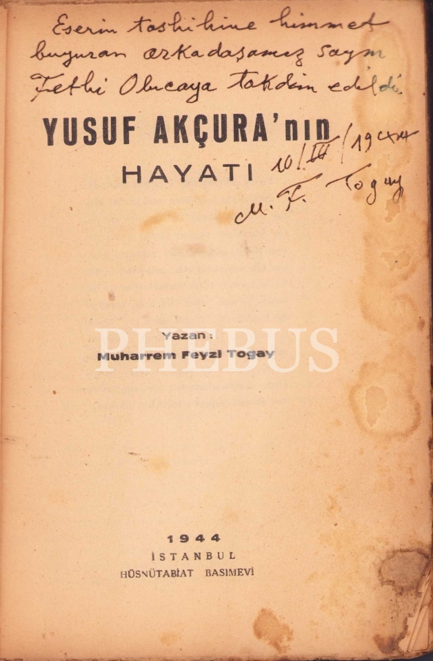 Yusuf Akçura'nın Hayatı, Muharrem Feyzi Togay'dan ithaflı ve imzalı, Hüsnütabiat Basımevi, İstanbul 1944, dış kapakta Akçura'nın bir portresi bulunmakta, 141 syf., 14x20 cm