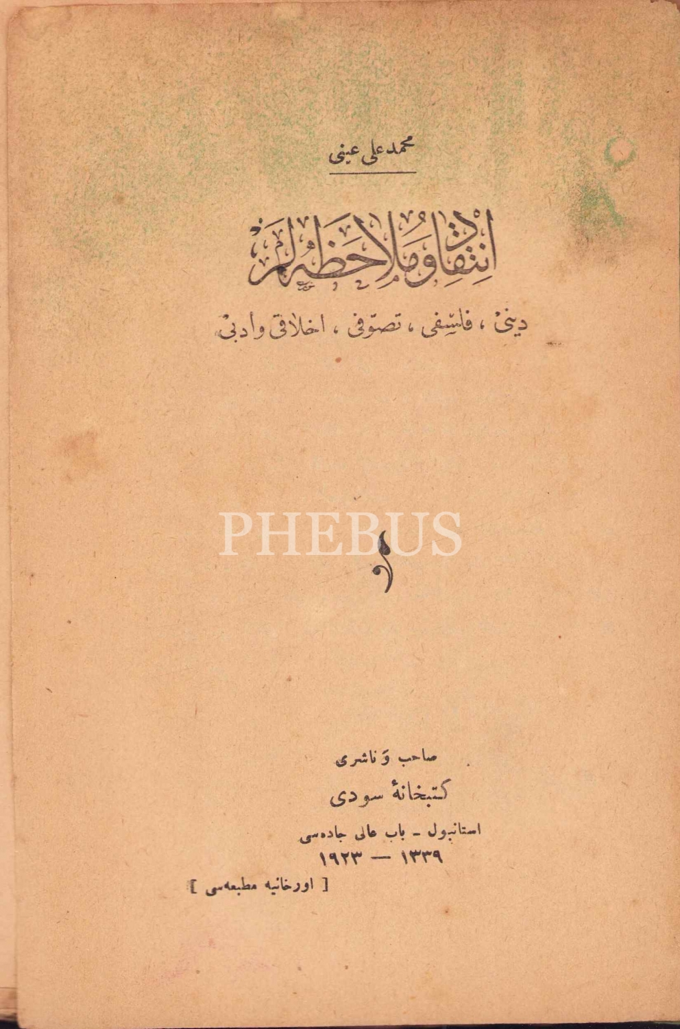 Osmanlıca İntikad ve Mülahazalar, Mehmed Ali Ayni, Sudi Kitabhanesi, İstanbul 1923, 251 syf., 15x21 cm