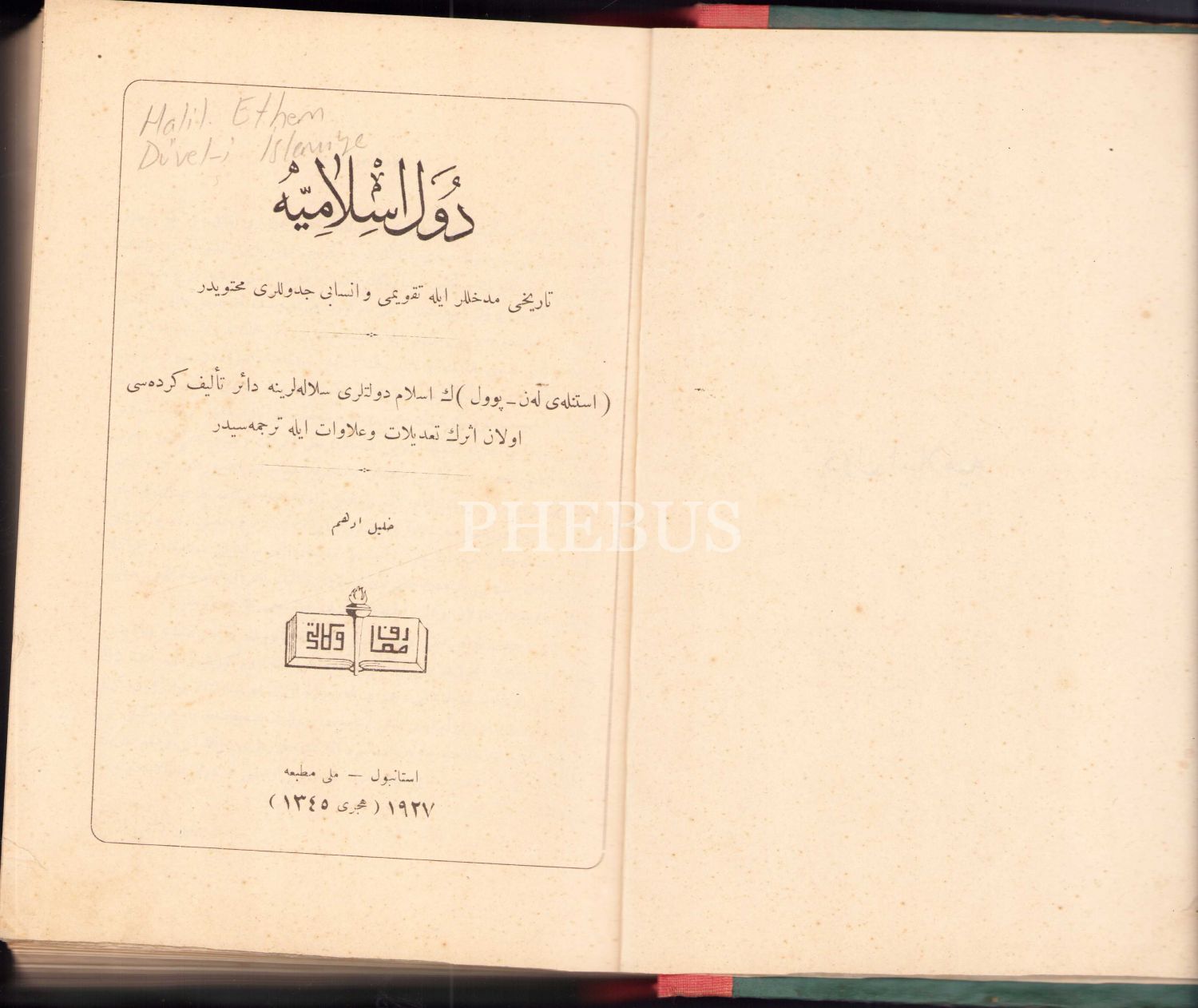 Osmanlıca Düvel-i İslamiyye [İslam Devletleri], Halil Edhem, takvim ve neseb cetvelleri içermekte, Milli Matbaa, İstanbul 1927, 640 syf., 17x24 cm