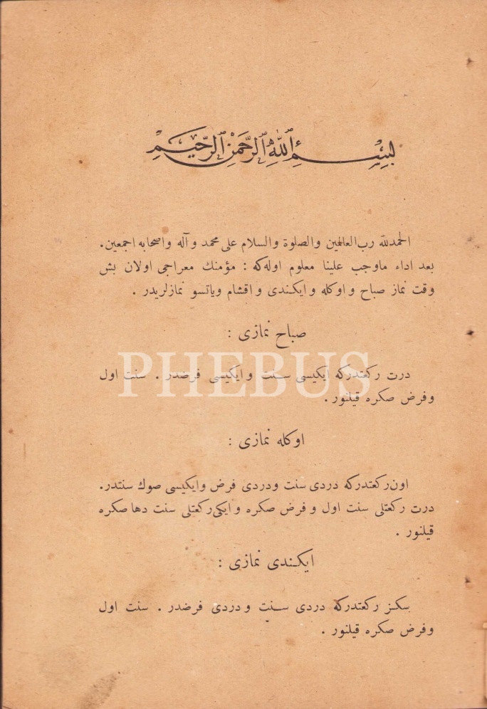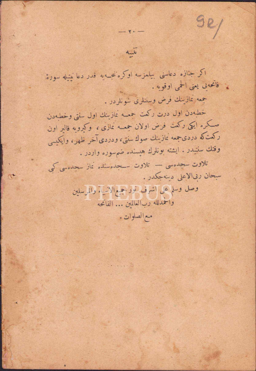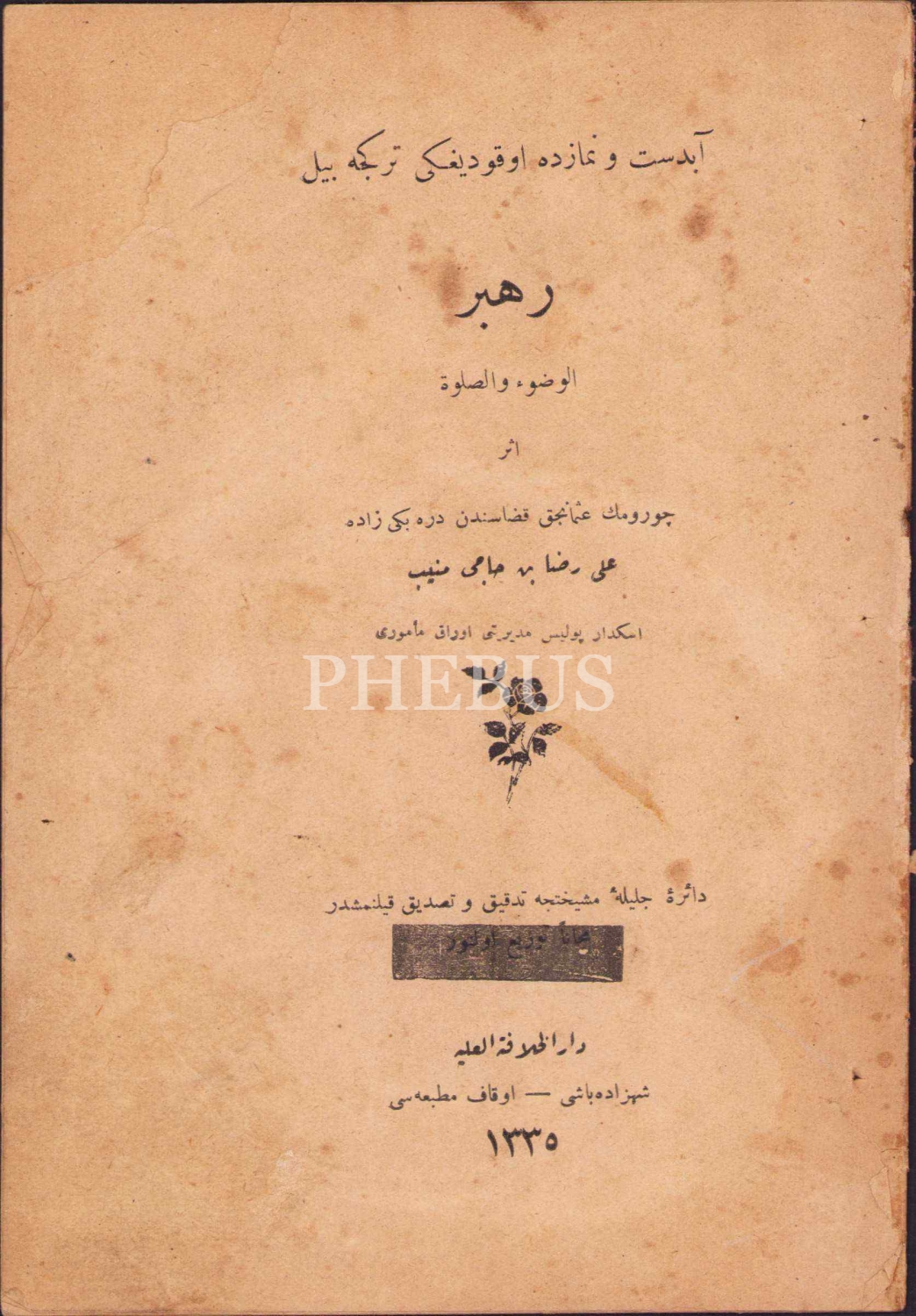 Osmanlıca Abdest ve Namazda Okuduğunu Türkçe Bil Rehberü'l-Vuzü ve's-Salat, Ali Rıza b. Hacı Münib, Evkaf Matbaası, İstanbul 1325, ön kapak bir kenar yırtık, 20 sayfa, 13x19 cm, ÖZEGE; 5