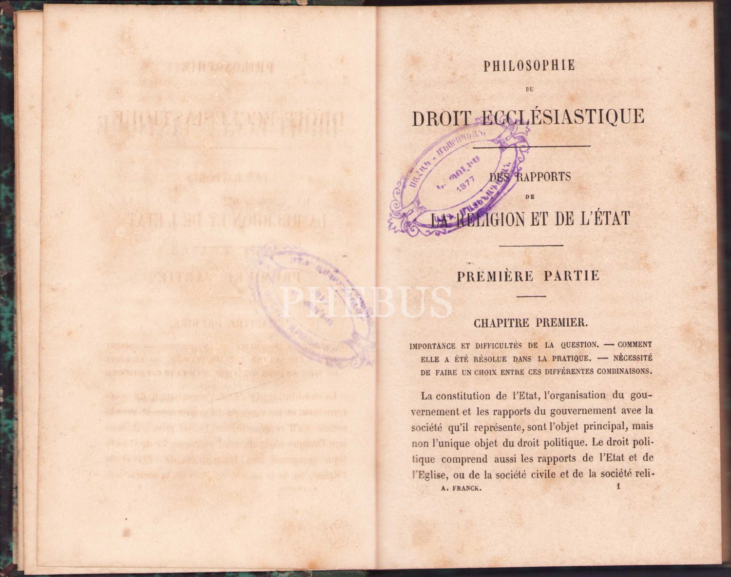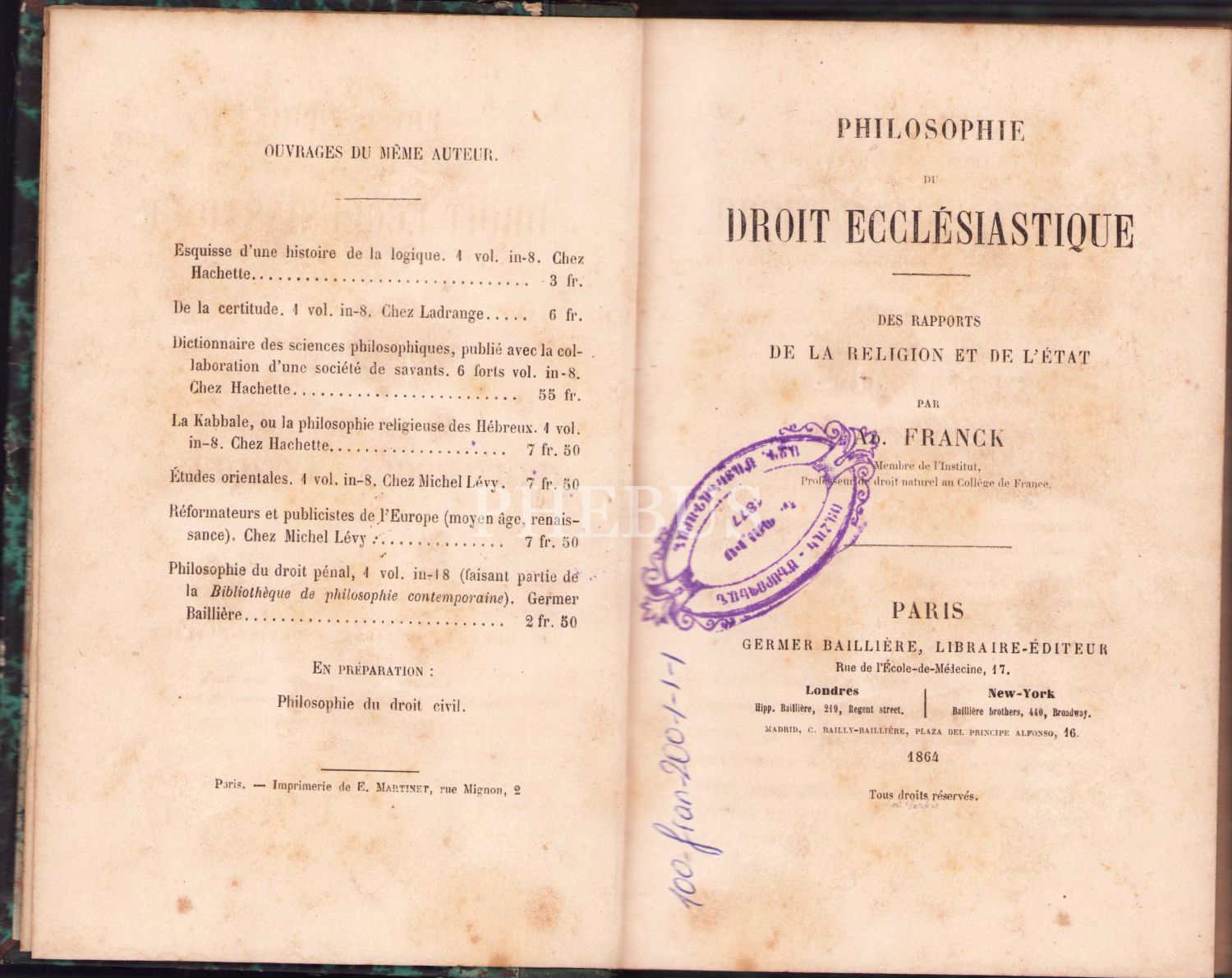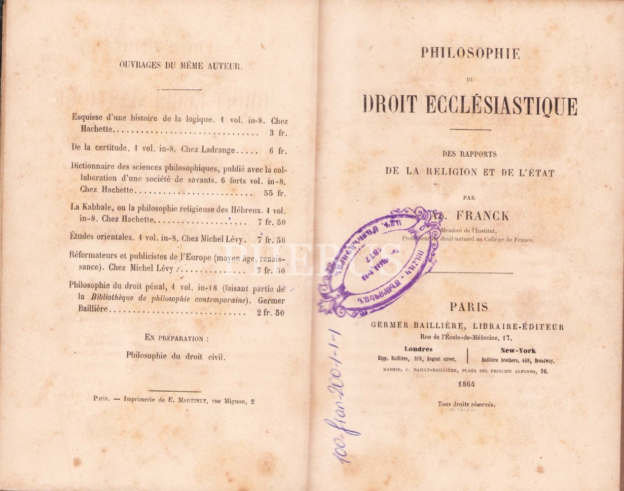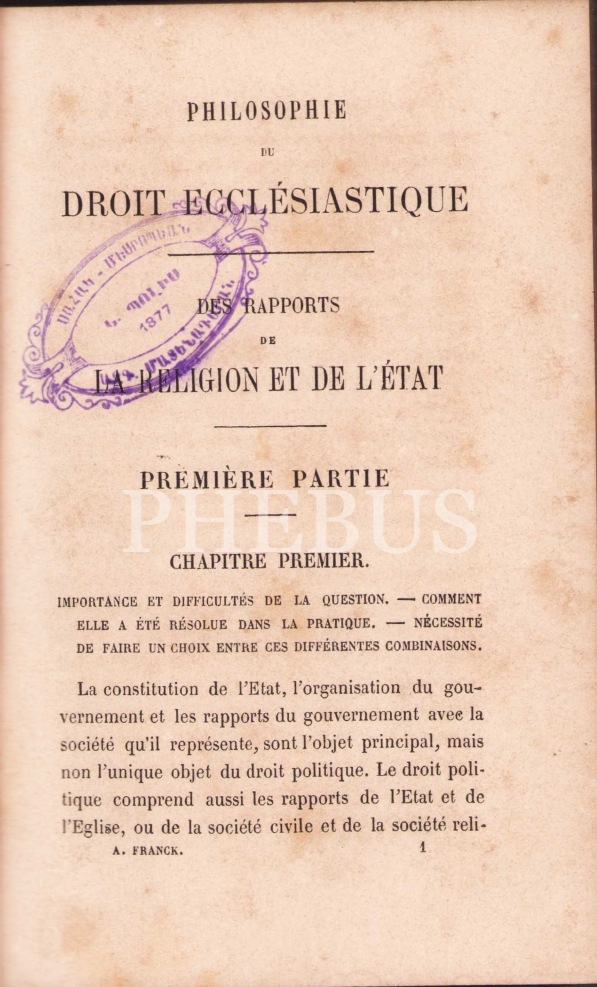 Philosophie Du Droit Ecclesiastique [Kilise Hukuku Felsefesi], Ad. Franck, Paris 1864, 192 sayfa, 11x17 cm