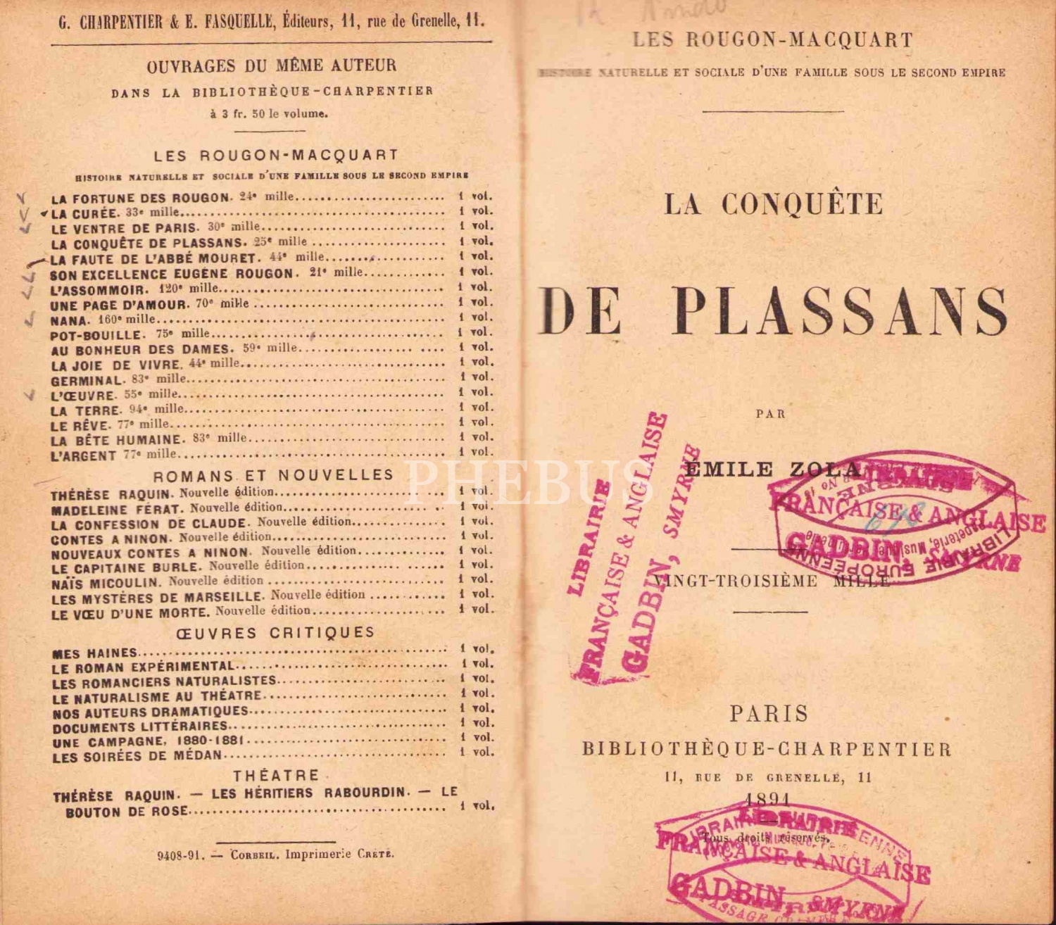 La Conquete De Plassans [Plassans'ın Fethi], Emile Zola, Paris baskı, 1891, Smyrne [İzmir] damgalı, 402 sayfa, 12x16 cm