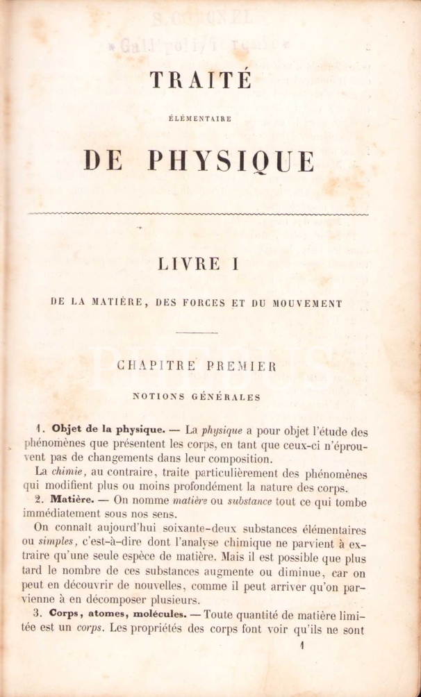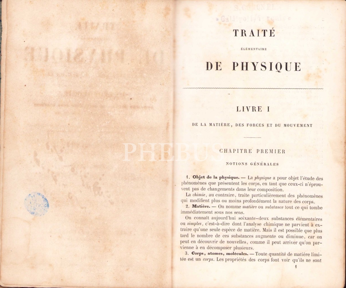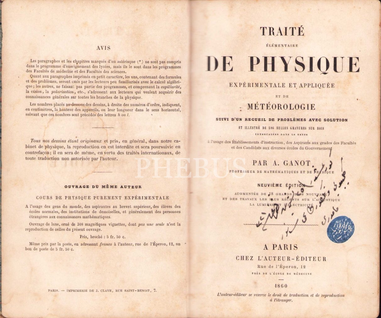Traite Elementaire De Physique Experimentale Et Appliquee Et De Meteorologie [Deneysel ve Uygulamalı Fizik ve Meteoroloji Üzerine Temel İnceleme], A. Ganot, Paris baskı, 1860, Osmanlıca ithaflı, 828 sayfa, 11x17 cm