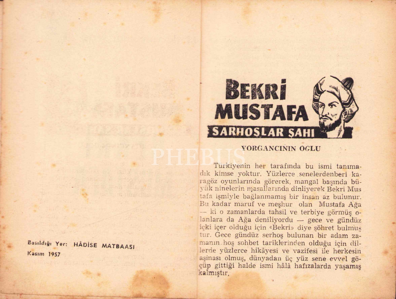 Bütün İstanbulun Sevdiği Adam Sarhoşlar Şahı Bekri Mustafa, Hadise Yayınevi, 1957, 80 sayfa, 12x14 cm