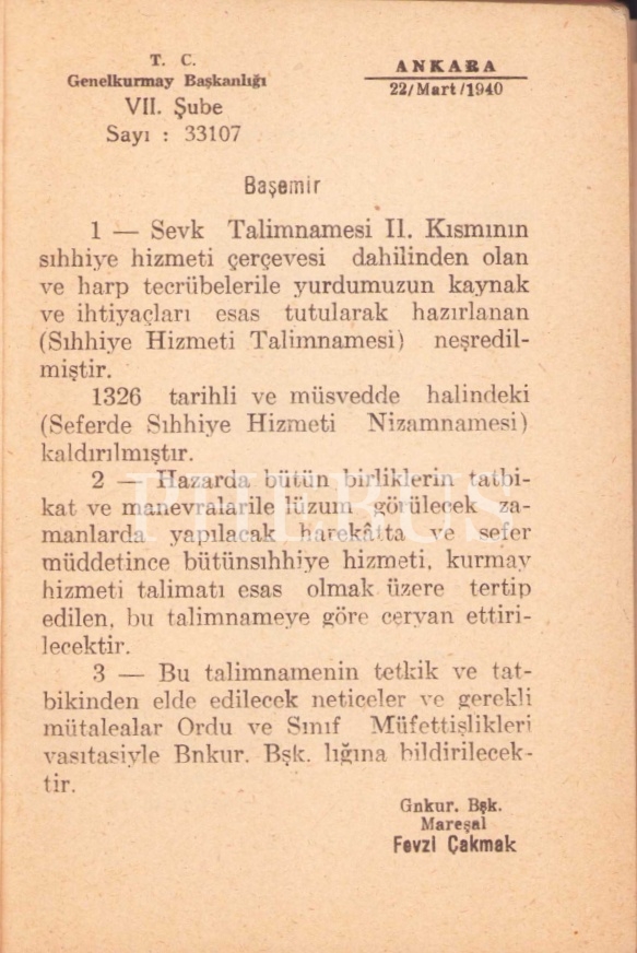 Her Sınıfa Mahsus Sıhhiye Hizmeti Talimnamesi, Üçüncü Baskı, Ankara 1948, 160 sayfa, 10x15 cm