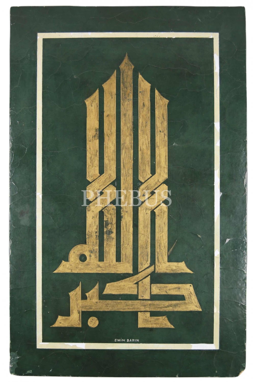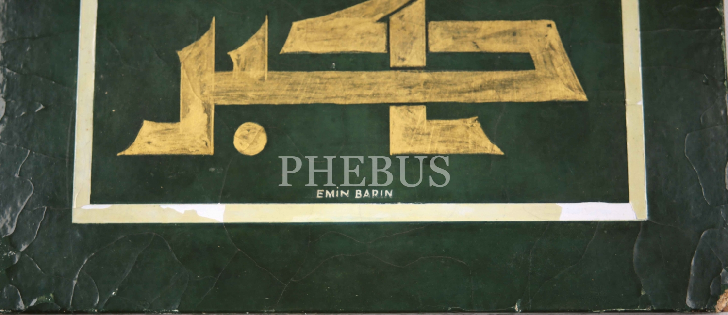 Hattat Emin Barın imzalı, ahşap lake üzerine Kufi istif: Allahu Ekber, 24x36 cm