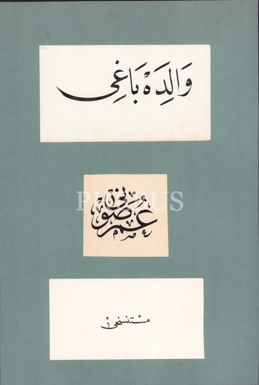 Hattat Hamid Aytaç terekesinden Sülüs Nesih yazı çalışmaları, "Valide Bağı, "Ömer Suna", "Müstensihi", 13x6 cm