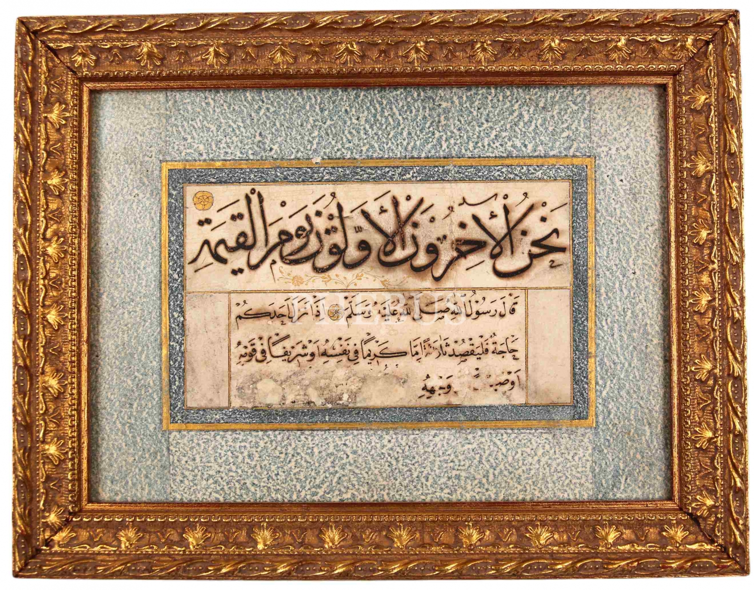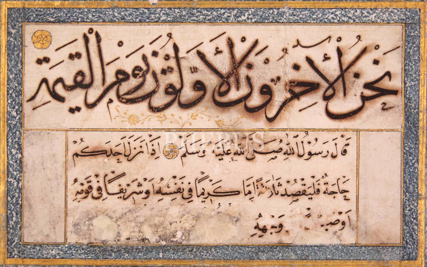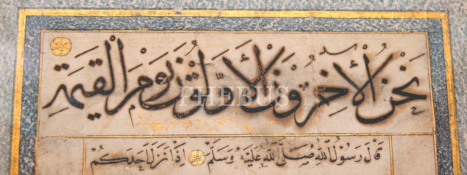 Erken Dönem Hoca İşi Sülüs Nesih Koltuklu Levha, ketebe kısmı silinmiş, dönem tezhipli, 15x9 cm