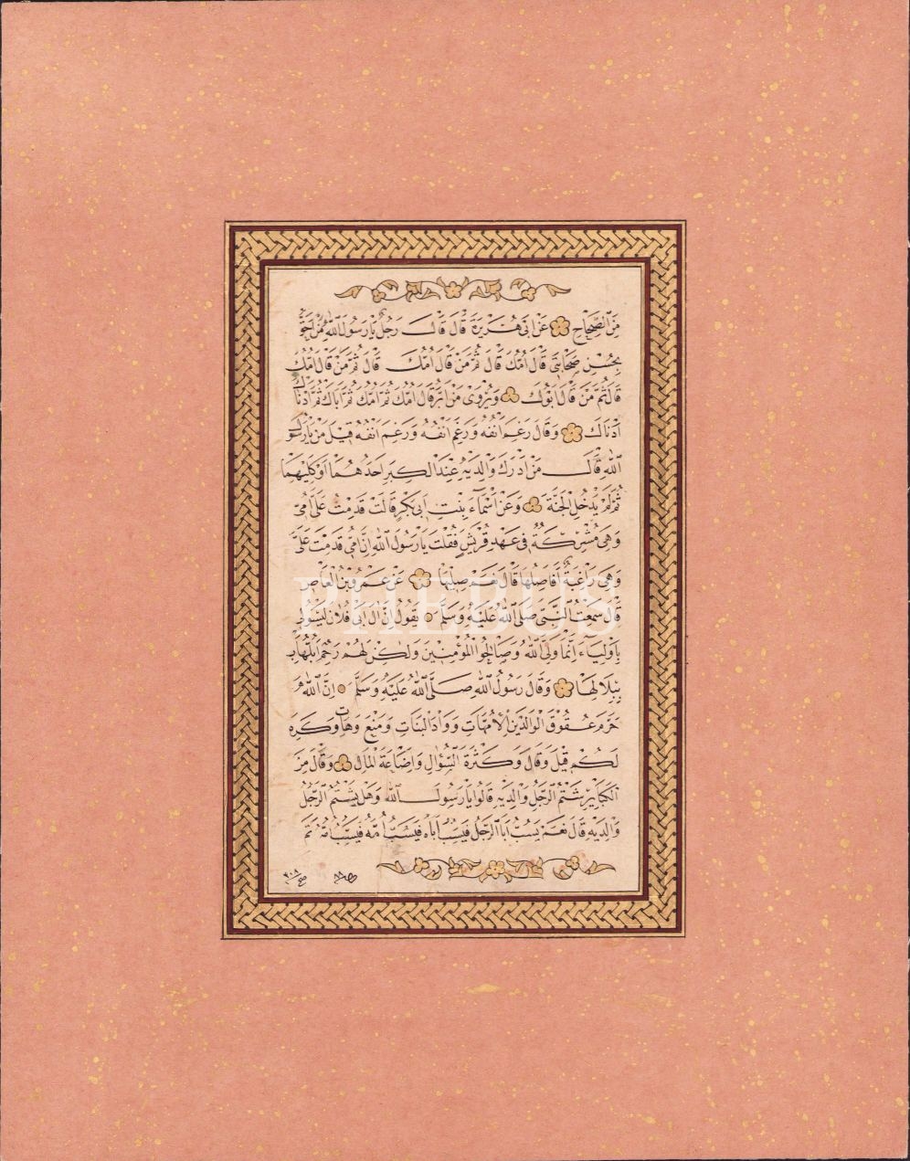 Nesih Hadis-i Şerif Levha, Ebu Hureyre'den rivayetle Hadis-i Şerif, H. 1308 tarihli, altın zencerek ve zerefşan tezhipli, 11x20 cm