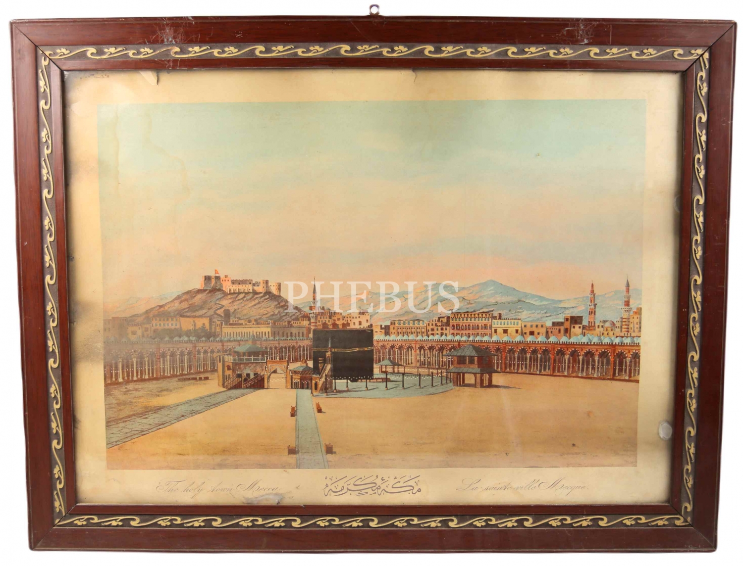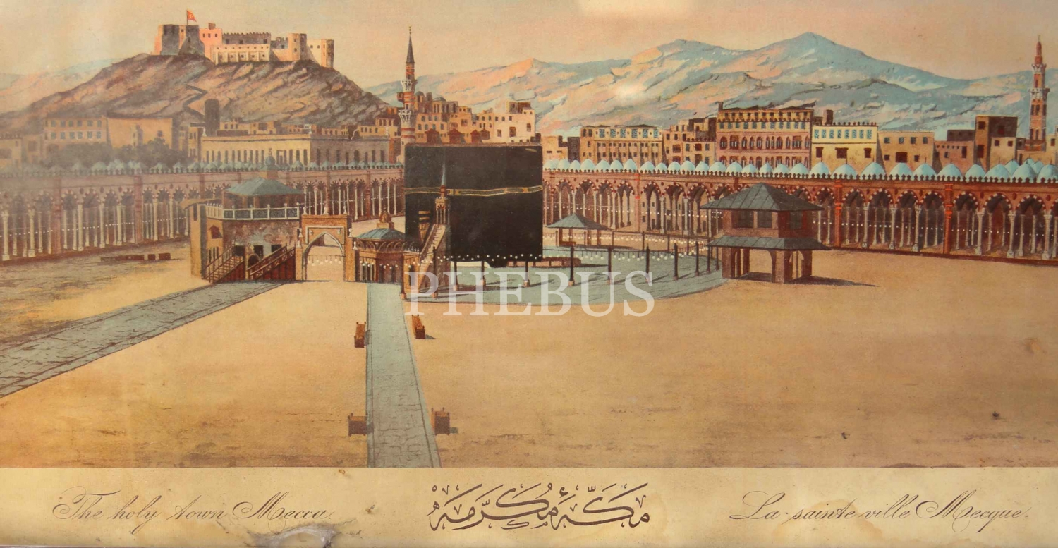 Taş Baskı Osmanlı Dönemi Mekke-i Mükerreme Afişi, Osmanlıca, Fransızca ve İngilizce, çerçeveli, 70x50 cm