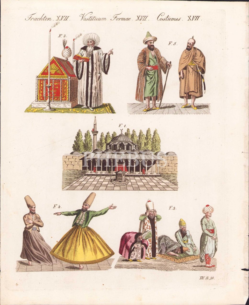 Osmanlı Dönemi Taş Baskı Gravür, Muhtelif Elbiseler,Dervişler, Semazen, Namaz Kılanlar, 20x25 cm