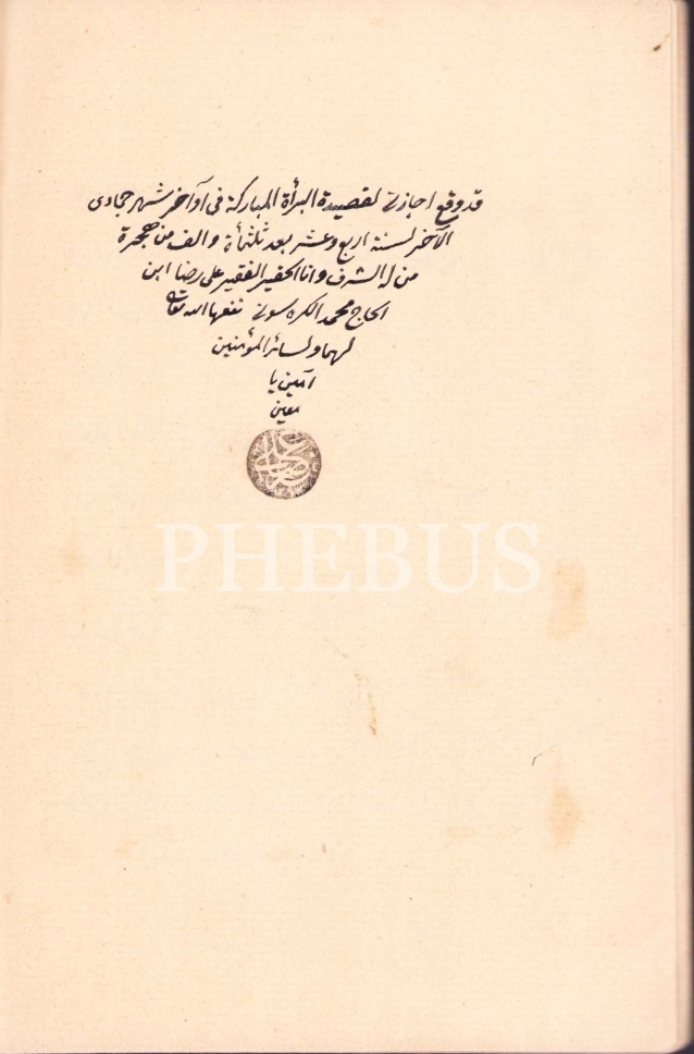 El Yazması Kaside-i Bürde İcazetnamesi, Ali Rıza b. El Hac Mehmed'den İbrahim b. Mustafa Efendi'ye verilmiş, 1314 tarihli, ebru cildinde, 5 varak, 13x20 cm