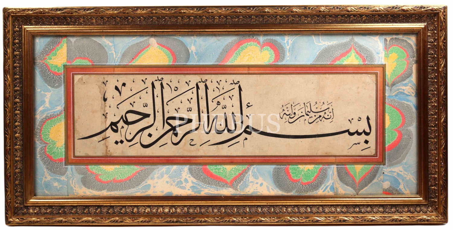 Hoca İşi Muhakkak Besmele-i Şerife, kenar kısımları hatip ebrulu, 45x13 cm