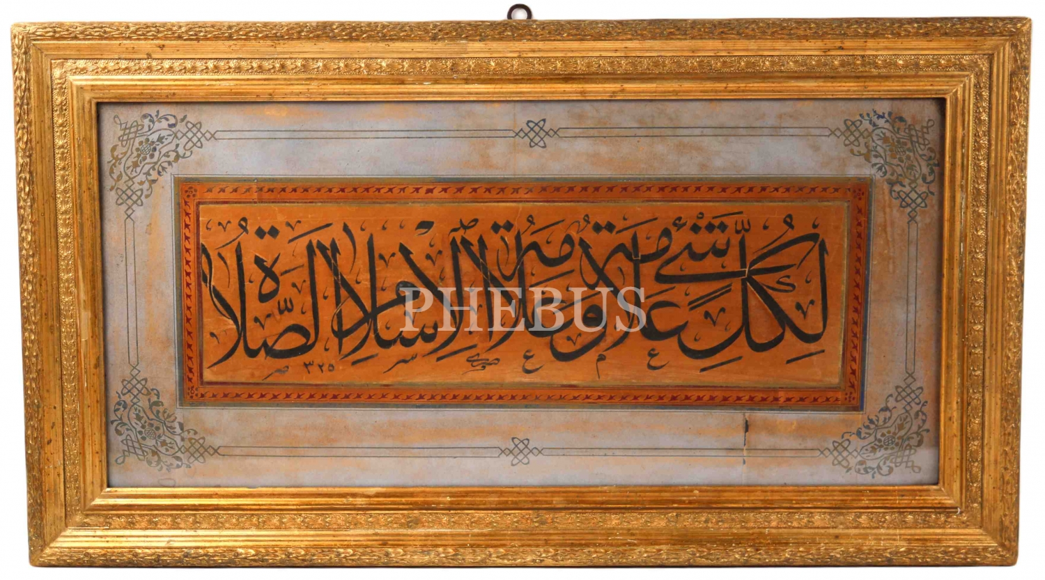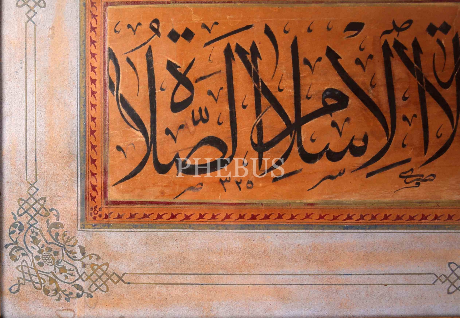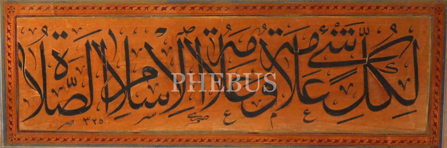 Hattat Şefik Bey'in talebesi Yusuf Sabri Efendi'ye ait Celi Sülüs Levha, altın varak çerçevesinde, 1325 tarihli, "Her Şeyin Bir Alameti Vardır İslamın Alameti de Salat [Namaz]dır",