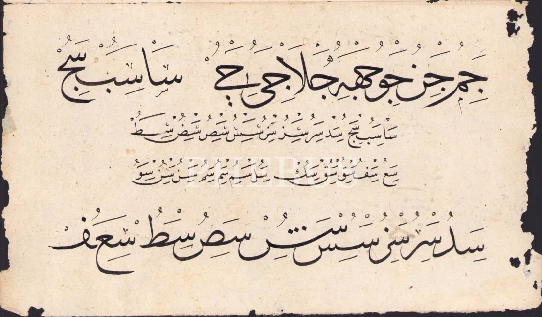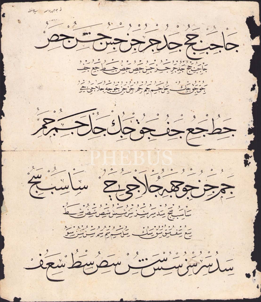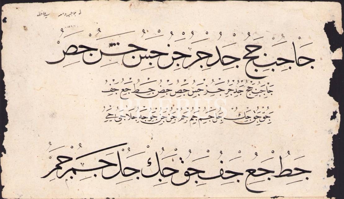 Erken Dönem Hoca İşi Sülüs Nesih Hurufat Meşki, sol üst köşede Osmanlıca "Seyyid Hafız" notu mevcut, 22x27 cm