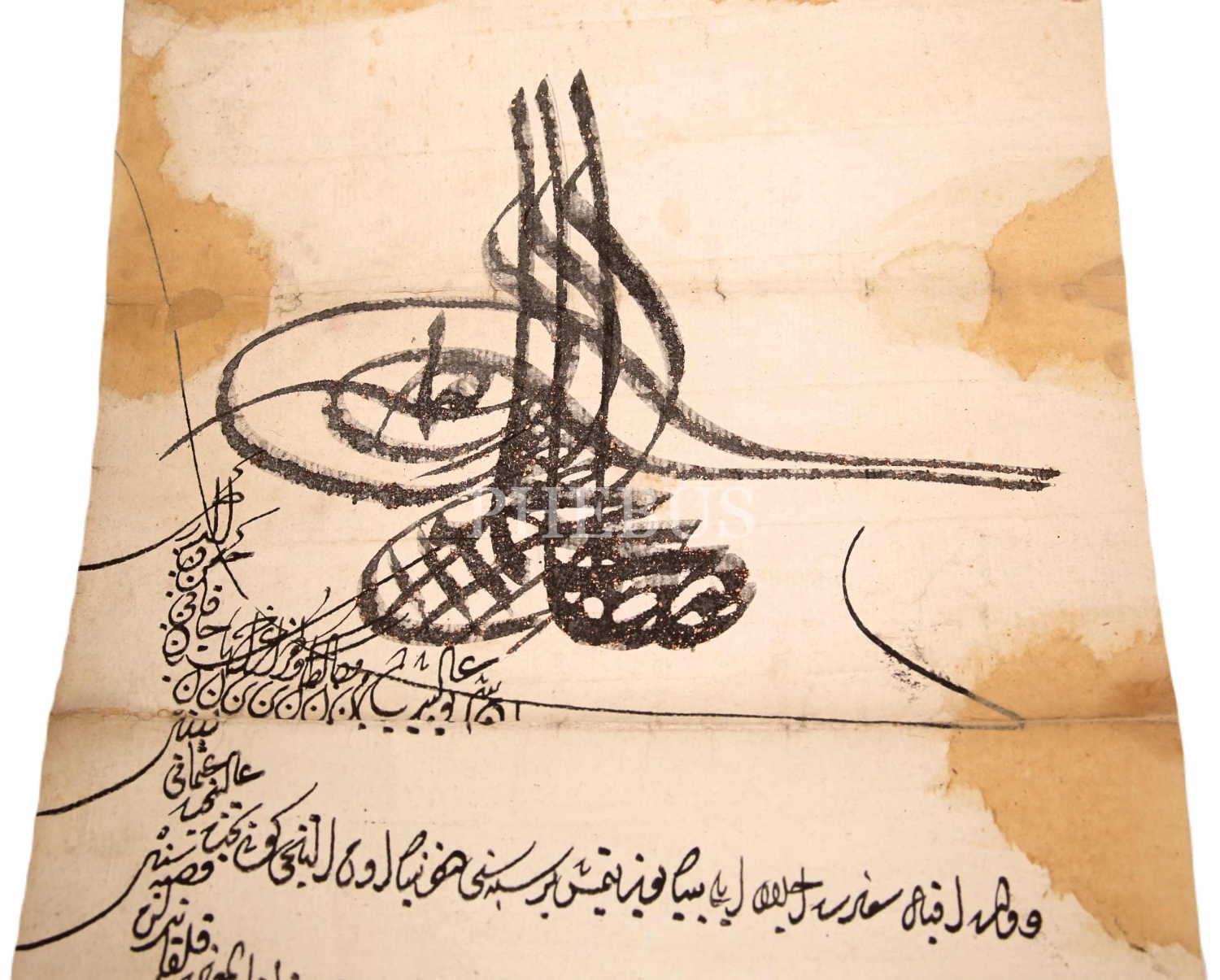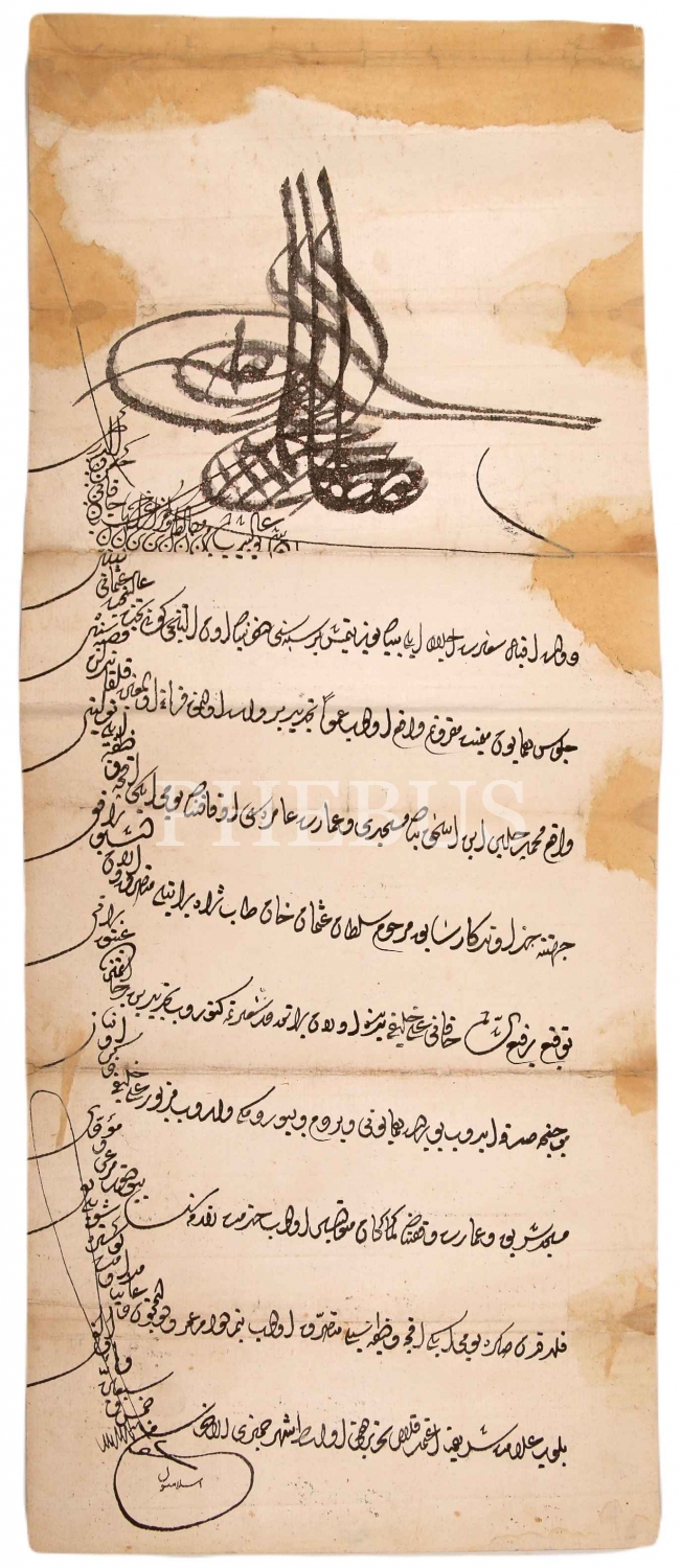 Sultan Üçüncü Mustafa Dönemi İmaret-i Amire'ye Dair El Çekme Tuğralı Berat, Sultan Mustafa'nın Cülusu Dolayısıyla Yenileme Beratı, tamirli haliyle,24x60 cm