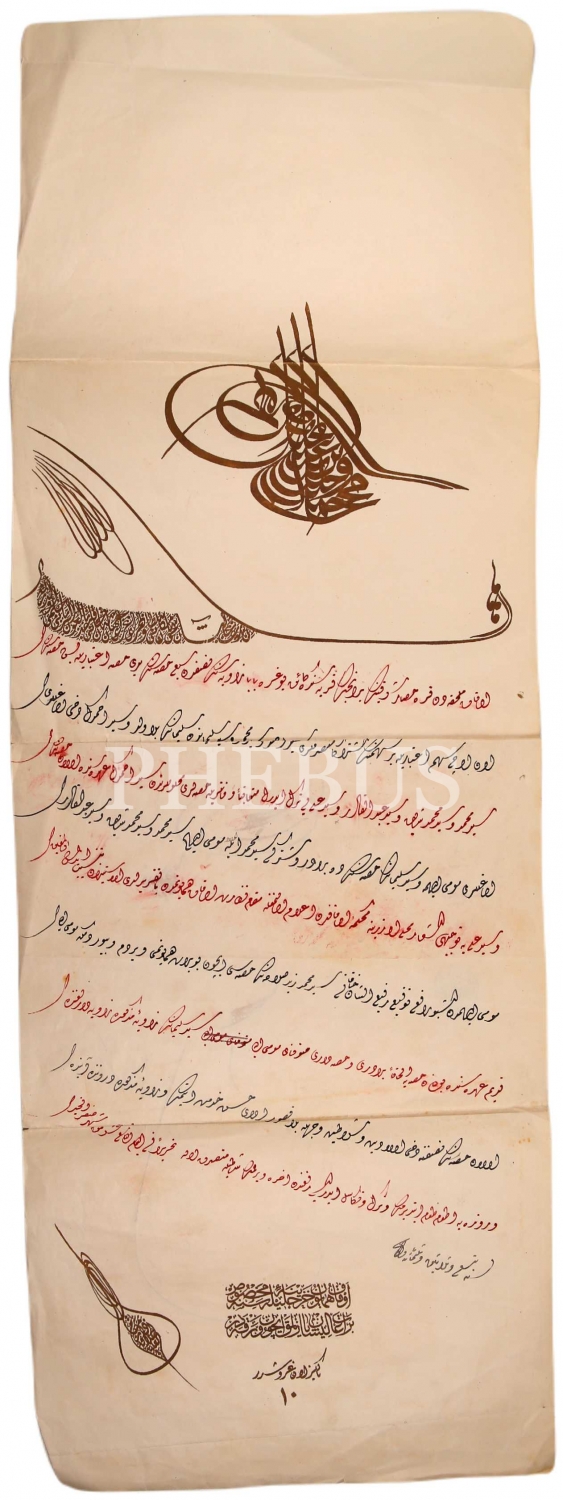 Karahisar-ı Şarki'de Bulunan Buğra Baba Zaviyesi için verilmiş Sultan Vahdettin tuğralı veraset beratı, 1339 tarihli, haliyle, 28x77 cm