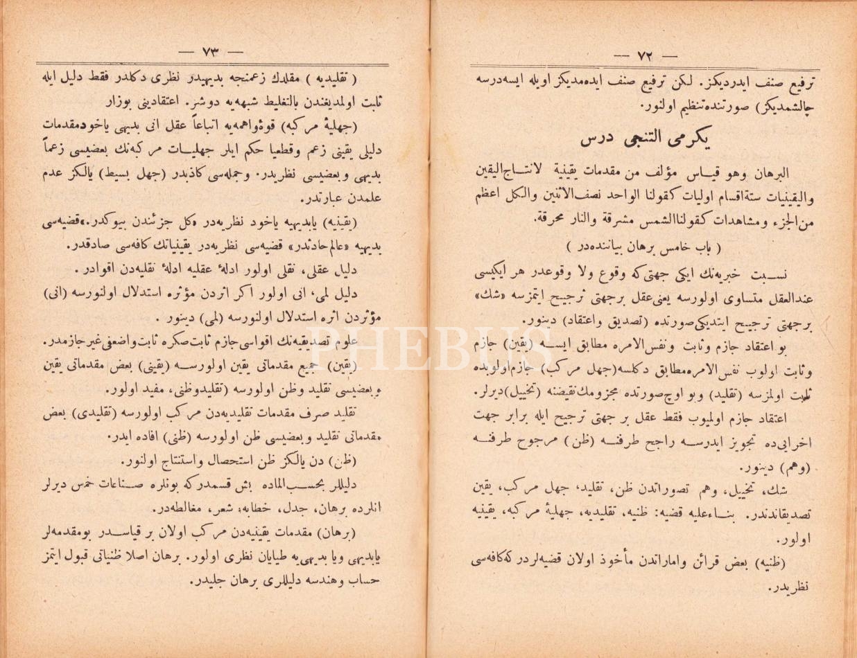 İthaf, "Semahatlü Nureddin Bey Efendi Hazretlerine takdim edilmiştir" şeklindedir. Eser, Mekteb-i Mülkiye`nin ikinci sınıfında okutulmak üzere, Ebherî`nin meşhur mantık klasiği olan İsâgûcî`ye bir şerh olarak yazılmış ve 1315/1897 yılında İstanbul`da neşredilmiştir. Bugün halen mantık sahasının başucu eserlerinden olan bu metni İzmirli`nin tercüme ve şerhiyle okumak hem mantık hem de İzmirli İsmail Hakkı meraklıları için son derece keyifli olacaktır.