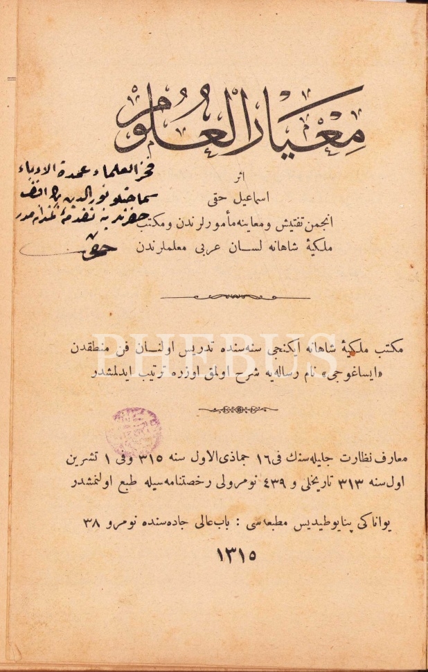 İzmirli İsmail Hakkı'nın Yayınlanan İlk Çalışması: Osmanlıca Miyarü'l Ulum, Yazarı İzmirli İsmail Hakkı'dan İmzalı ve İthaflı, Panayotidis Matbaası, 1315, İstanbul, 97 sayfa, 12x20 cm