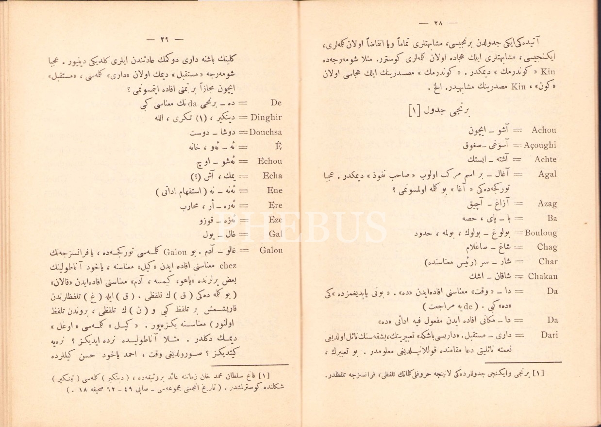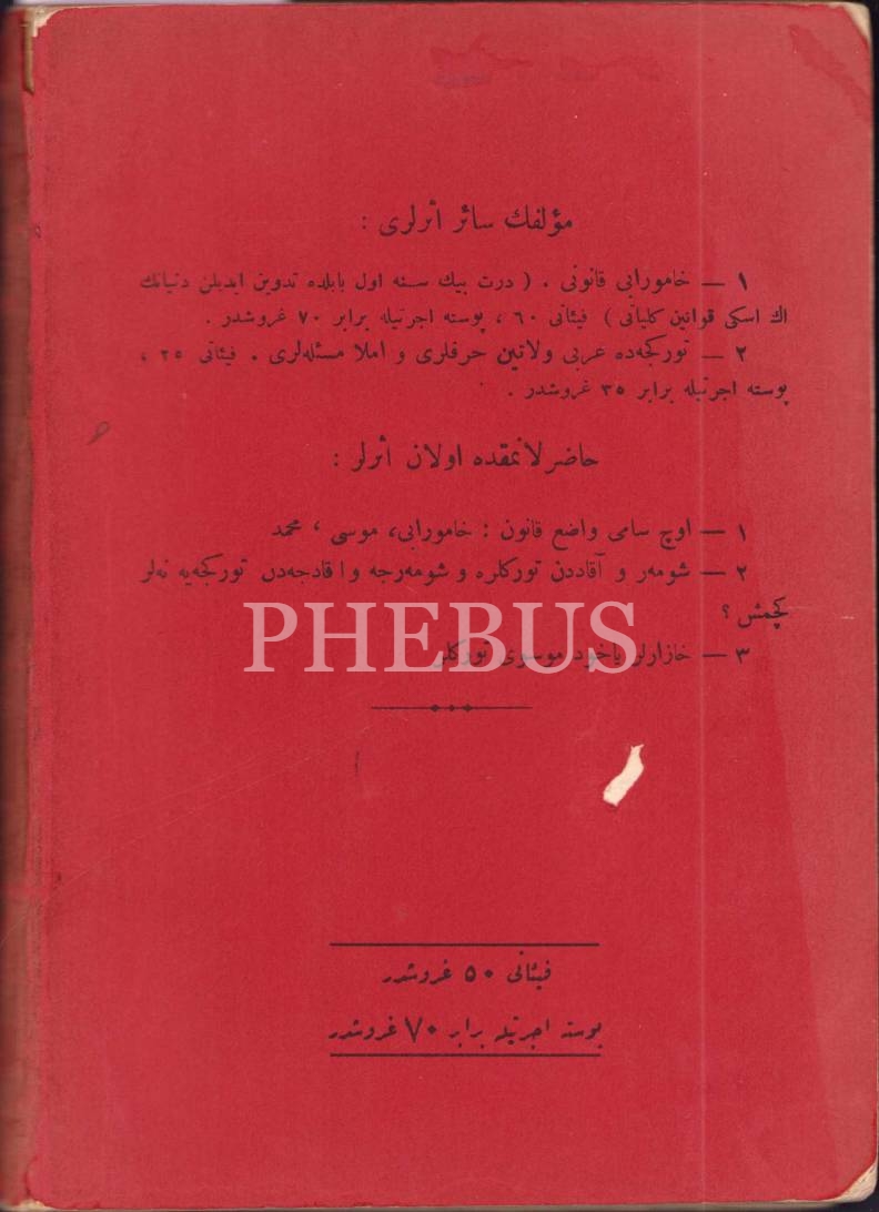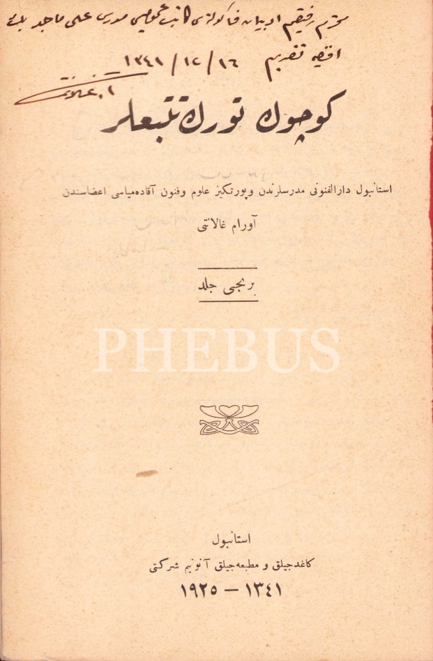 İthaf, "Muhterem Refikim Edebiyat Fakültesi Katib-i Umumisi Müdürü Ali Macid Bey Efendi'ye takdim. 16/ 12/ 1341 A. Galanti" şeklindedir.Avram Galanti veya Abraham Galante (4 Ocak 1873, Bodrum, Muğla - 8 Ağustos 1961, İstanbul), Türk eğitimci, siyaset adamıdır. Soyadı Kanunu ile Bodrumlu soyadını almıştır. 1915 ile 1933 yılları arasında Darülfünun'da eğitimci ve profesör olarak çalıştı. 1944-46 yıllarında Cumhuriyet Halk Partisi listesinden T.B.M.M. 7. Dönem Niğde milletvekilliği yaptı. Rodos Rüşdiyesi ve İzmir Sultani İdadisi'nden mezun oldu. Rodos'ta öğretmenlik ve adalardaki Yahudi ve Türk okullarında maarif müfettişliği yaptı. Daha sonra, İttihat ve Terakki Cemiyeti'ne katıldı ve cemiyetin aktif ve ileri gelen elemanlarından biri oldu. Akademisyenlik yaptı. Cumhuriyetle birlikte kültürel devamlılığı savunduğu ve Harf ve Dil Devrimlerine karşı çıktığı için üniversite kadrosunun dışında kaldı. Daha önce de Çağlayan dergisinde alfabe tartışmaları üzerine yayımladığı makalesinde bunun zararlı sonuçlarına değinmişti (1925-1926).[1] Galanti 1943 yılına gelindiğinde ise Niğde'den milletvekili seçildi. 1961 yılında hayatını kaybetti. Galanti, aynı zamanda yabancı dilde eğitime karşı çıkanların da öncüsüdür. Galanti, bu konuda yazdıkları bağlamında yabancı dilde eğitimi ilk eleştiren ve karşı çıkan kişi olarak bilinir. Döneminde önemli fikir ayrılıklarından biri de Latin harflerine muhalif olmasıdır. Türkiye Musevilerinin Türkleşmesini de savunmuştur