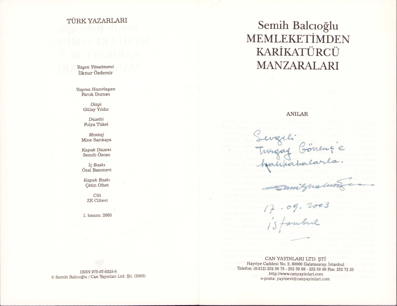 Karikatürist Semih Balcıoğlu'ndan Ressam Turgay Gönenç'e imzalı ve ithaflı "Memleketimden Karikatürcü Manzaraları" -anı- İlk Baskı, Can Yayınları, 2003, 316 sayfa, 13x19 cm
