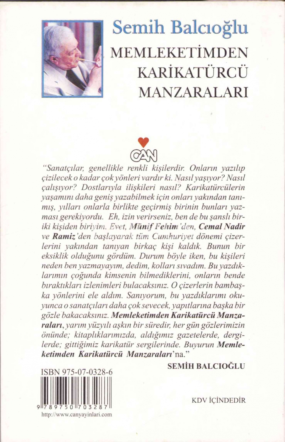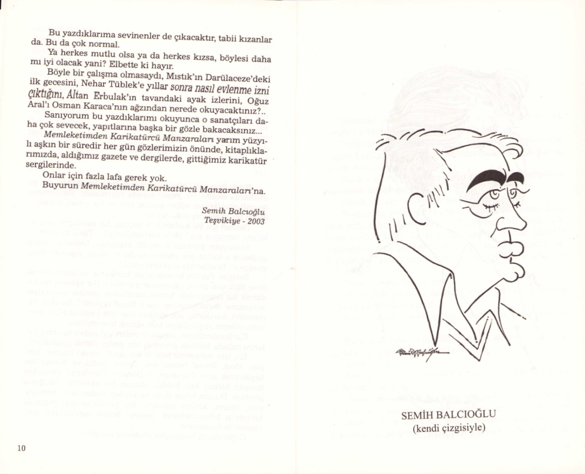 İthaf, "Sevgili Turgay Gönenç'e kahkahalarla 17.09.2003" şeklindedir. 1928'de İstanbul'da doğan Semih Balcıoğlu, Işık Lisesi'nin ardından Devlet Güzel Sanatlar Akademisi'nin grafik bölümünden mezun olmuştur. Akbaba başta olmak üzere, birçok dergi ve gazetede karikatürleri yayımlanmıştır. 2006'da İstanbul'da vefat etmiştir.