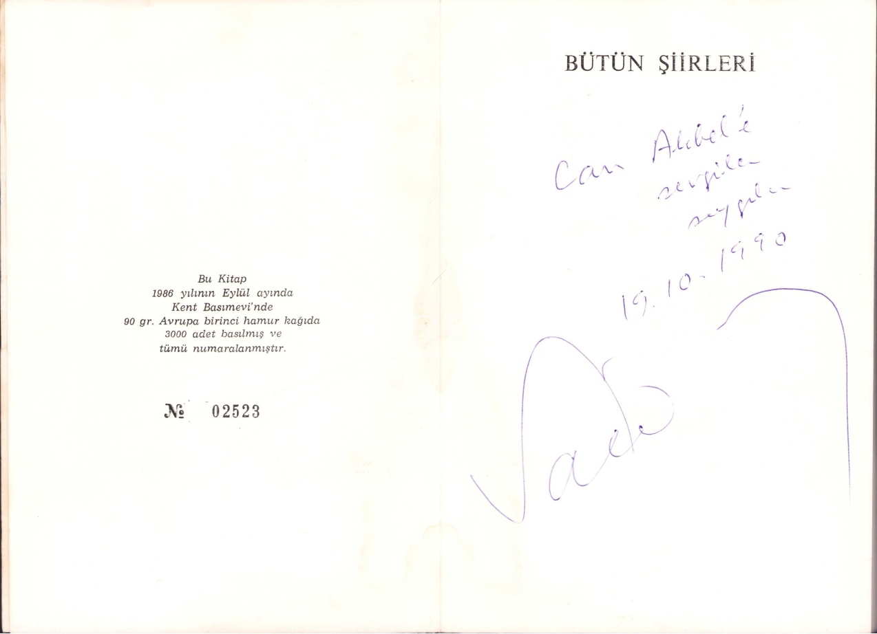 Salah Birsel'den imzalı ve ithaflı "Bütün Şiirleri", İlk Baskı, Ada Yayınları, 1986, 153 sayfa, 13x19 cm
