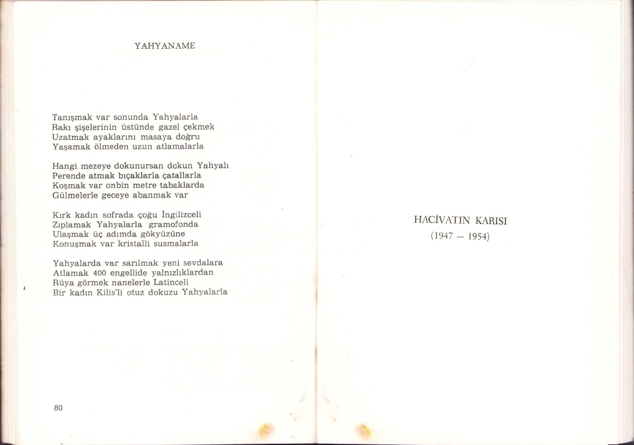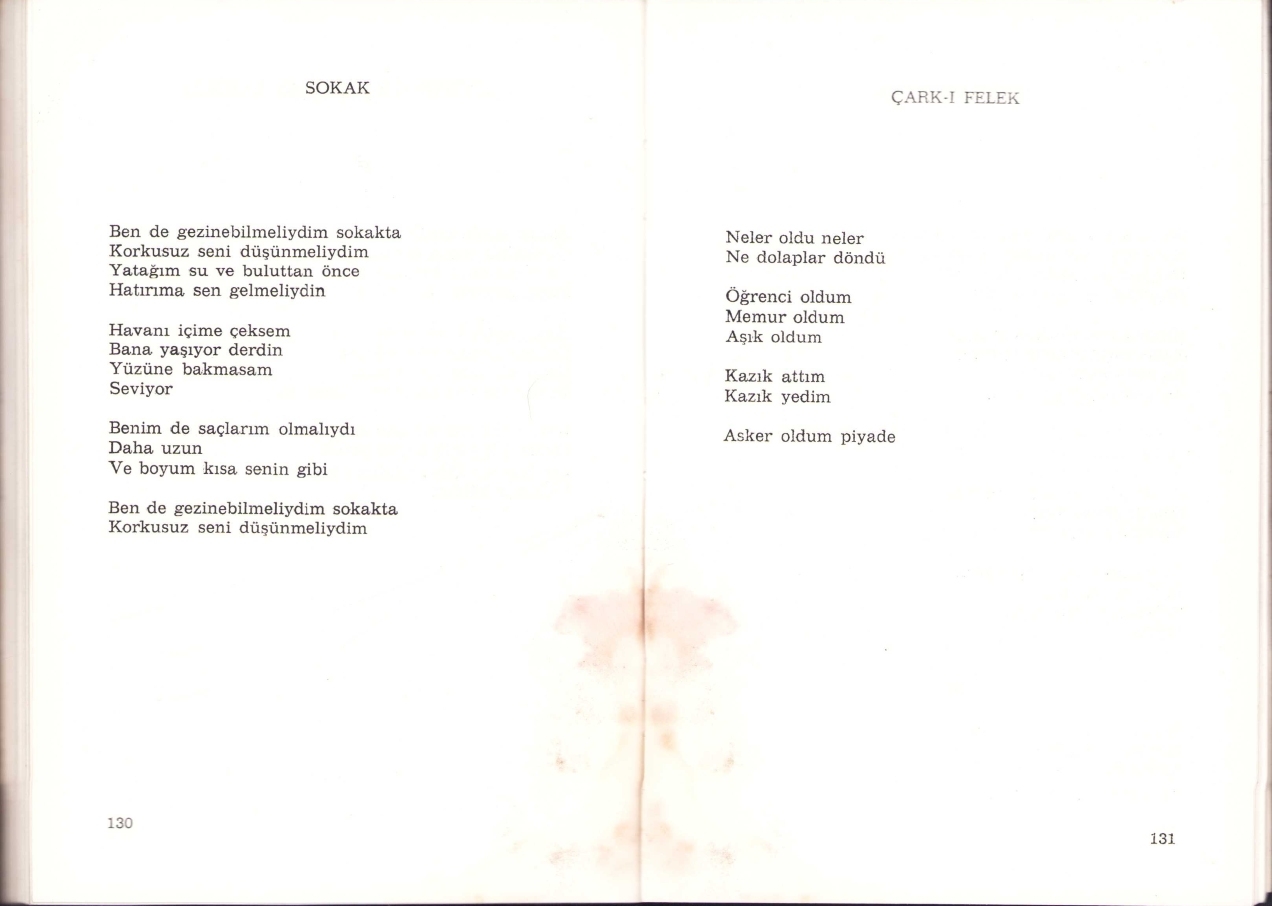 İthaf, "Can Akbal'a sevgiler saygılar 19.10.1990" şeklindedir. "Benim de saçlarım olmalıydı/ Daha uzun/ Ve boyum kısa senin gibi/ Ben de gezinebilmeliydim sokakta/Korkusuz seni düşünmeliydim"