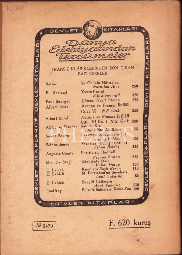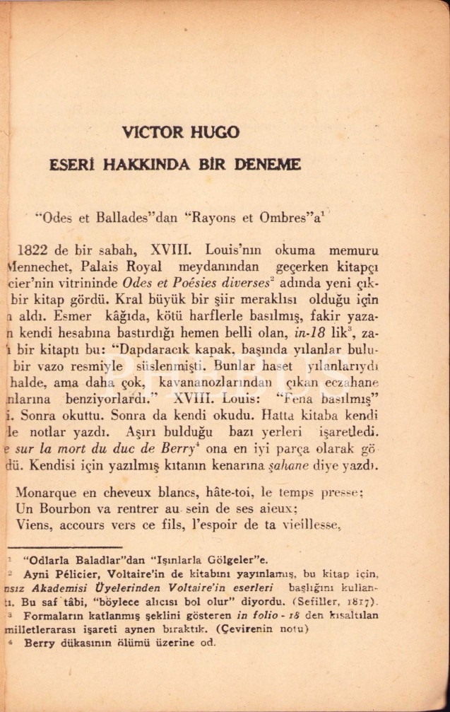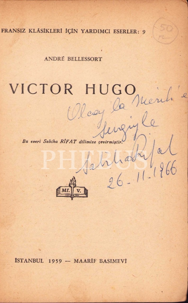 Türkiye'nin İlk Kadın Mühendisi Sabiha Rifat Hanım'ın çevirisiyle Andre Bellessort imzalı "Victor Hugo" monoloğu, imzalı ve ithaflı, Maarif Vekaleti Yayınları, İlk Baskı, 1959, 347 sayfa, 14x19 cm