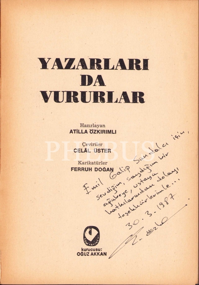 Hazırlıyan Atilla Özkırımlı'dan Gazeteci Yazar Emil Galip Sandalcı'ya ithaflı ve imzalı Yazarları da Vururlar, İlk Baskı, 1987, Cem Yayınevi, 169 sayfa, 13x20 cm
