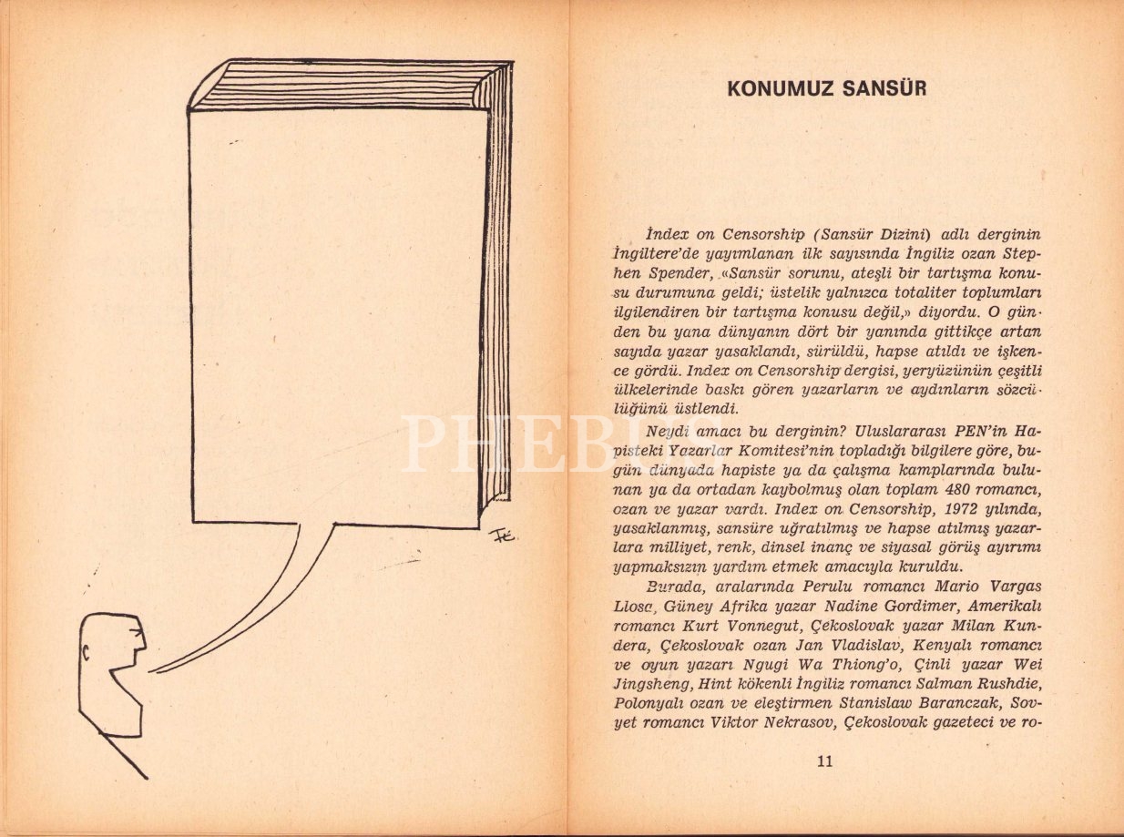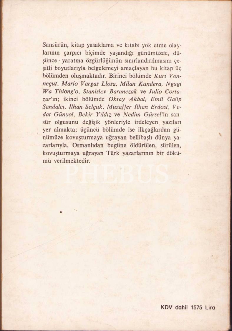 İthaf, "Emil Galip Sandalcı için, sevdiğim, saydığım bir ağabeye, ustaya katkılarından dolayı teşekkürlerimle 30.3.1987" şeklindedir. "Sansürün, kitap yasaklama ve kitabı yok etme olaylarının çarpıcı biçimde yaşandığı günümüzde, düşünce-yaratma özgürlüğünün sınırlandırılmasını çeşitli boyutlarıyla belgelemeyi amaçlayan bu kitap... [Kitaptan]"