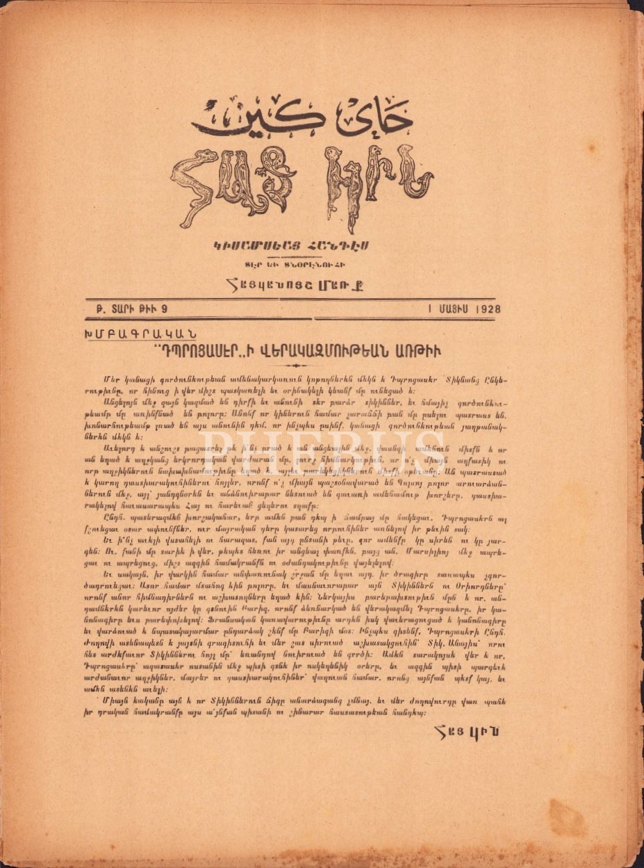 Ermenice Hay Gin Kadın Mecmuası, 9. sayı, 1928, 25x34 cm, kenarları haliyle