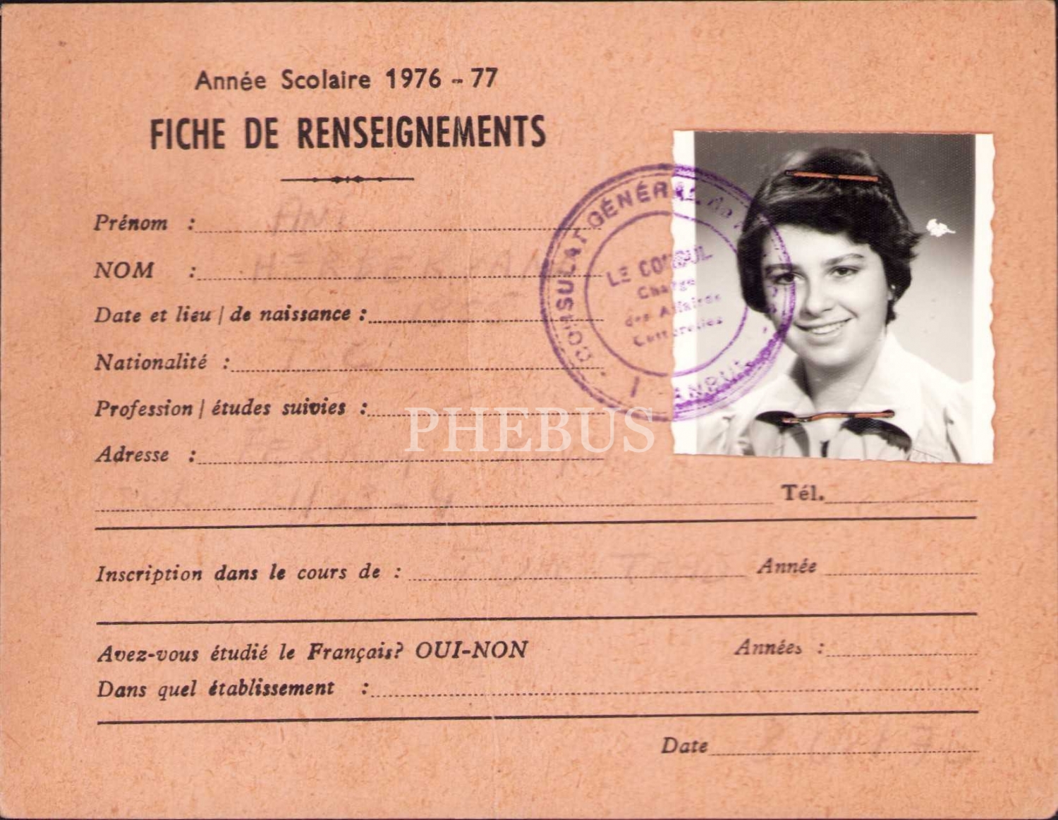Fransızca 1976-77 eğitim yılına ait bir öğrenci kimlik kartı, 11x14 cm