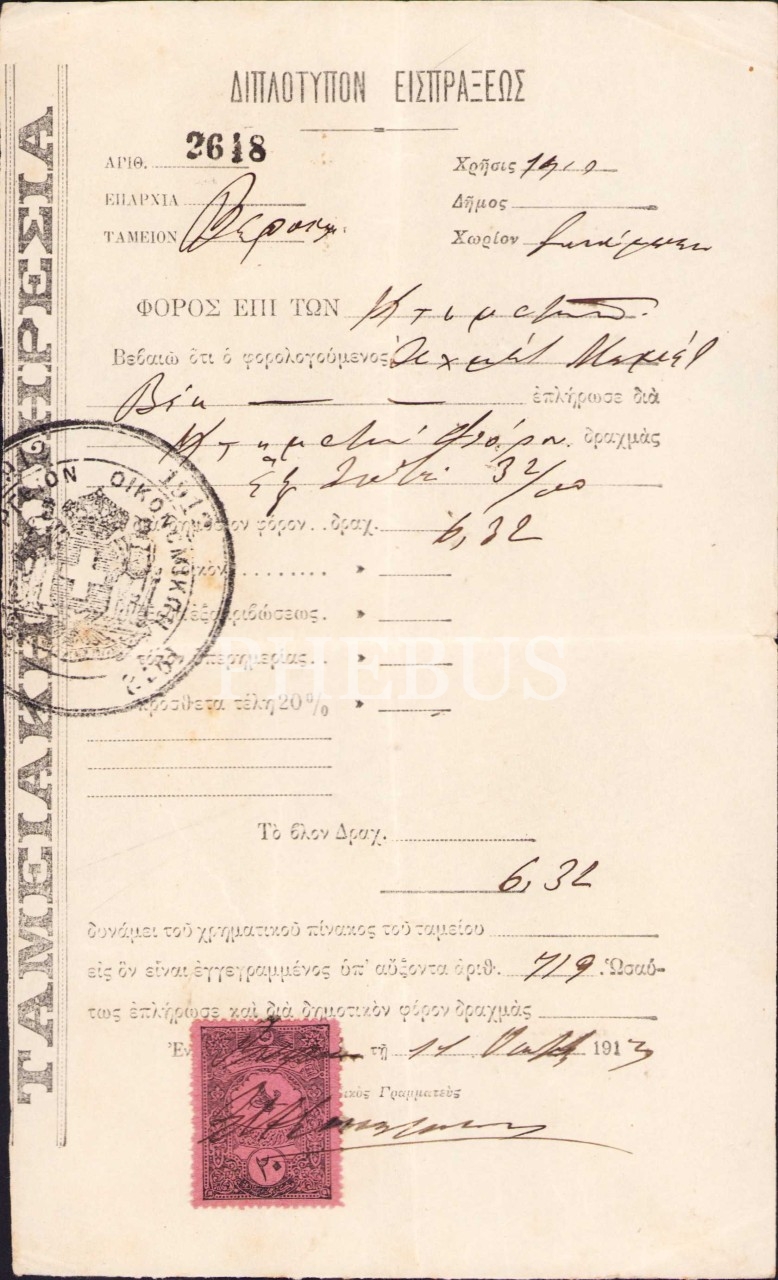 1913 tarihli Osmanlıca pullu Yunanca evrak, 14x23 cm