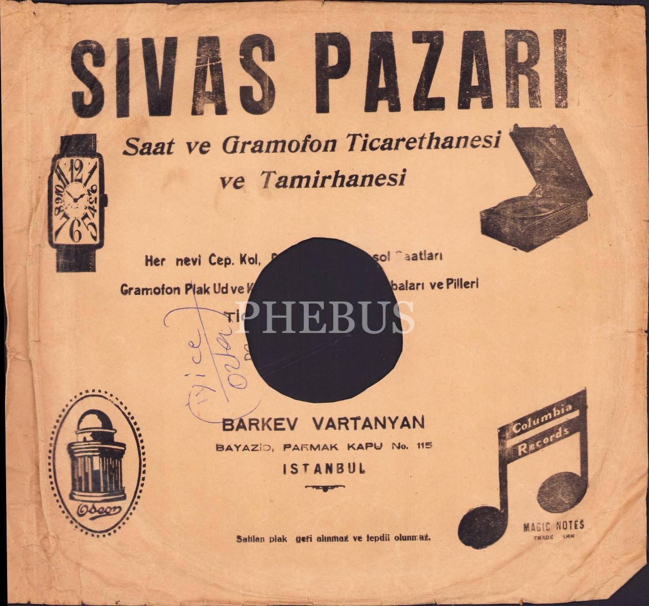 Sivas Pazarı Saat ve Gramofon Ticarethanesi - Barkev Vartanyan - Bayazid Parmak Kapu İstanbul yazılı plak kılıfı, 11x11 cm, kenarları haliyle