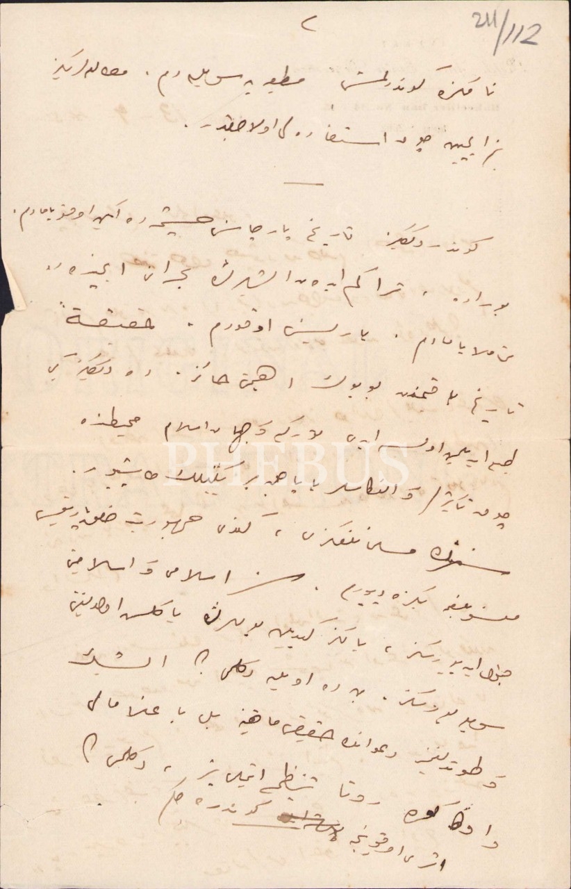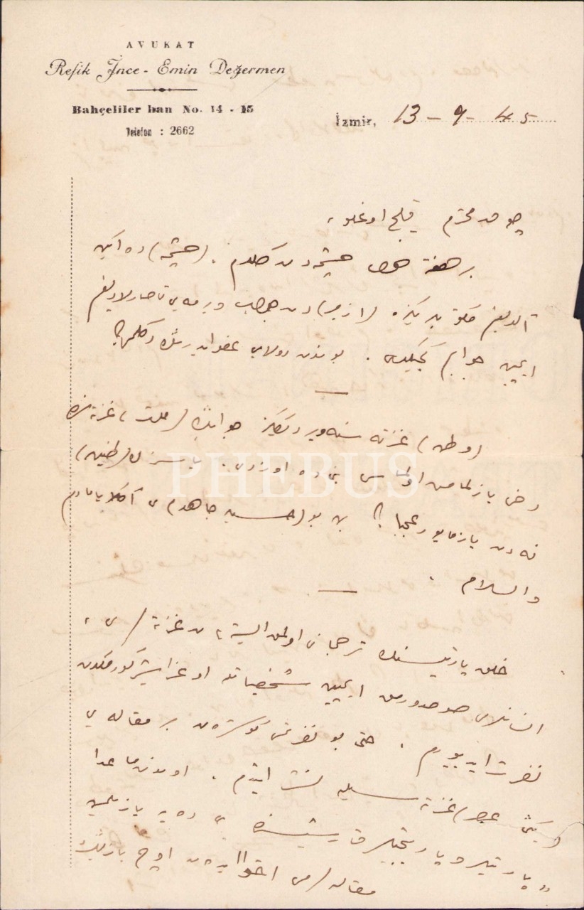 Türk siyasetçi Refik İnce'nin İsmail Hakkı Kılıçoğlu'na yazdığı Osmanlıca mektup, İzmir 1945, 14x22 cm