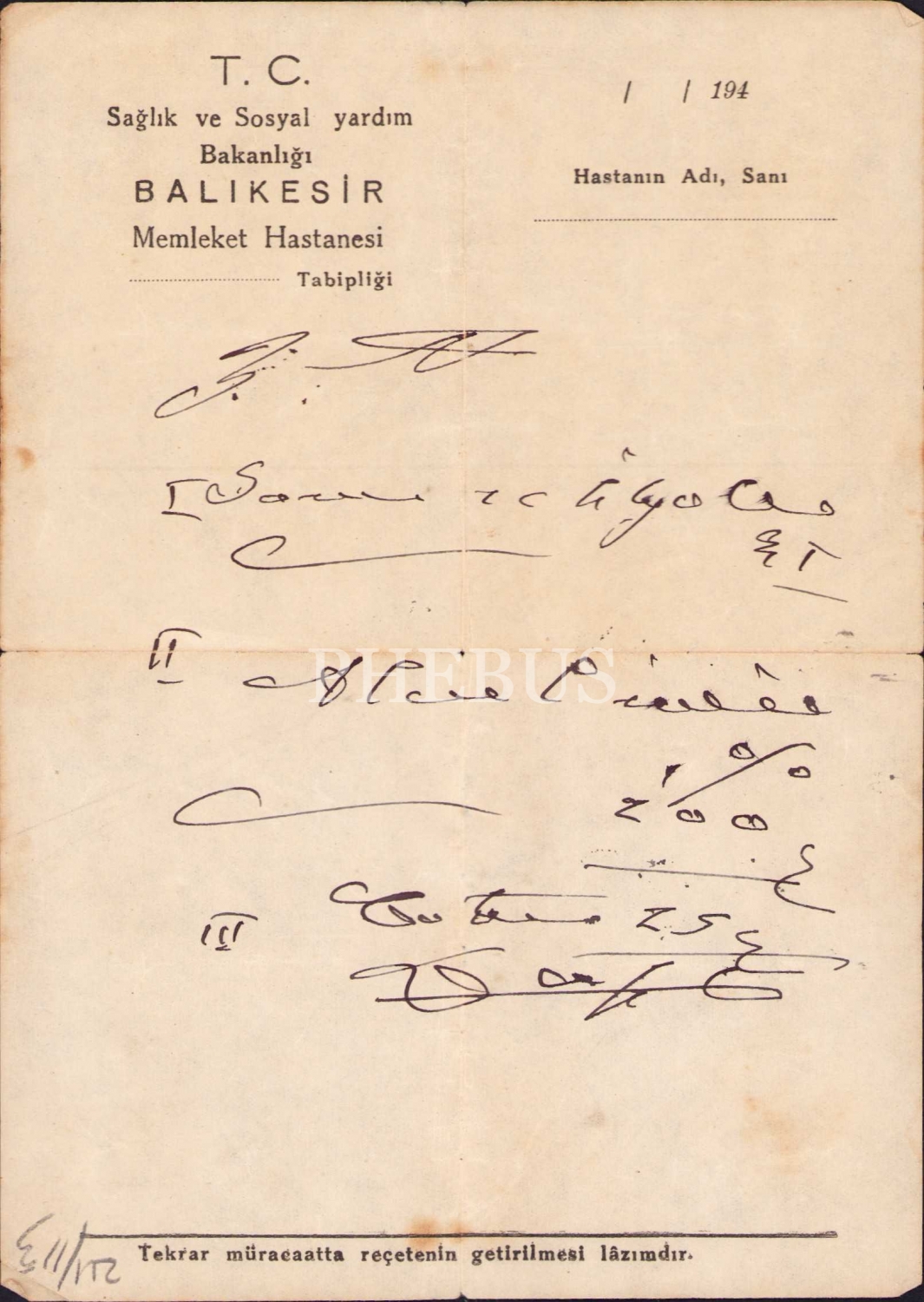 T.C. Sağlık ve Sosyal Yardım Bakanlığı Balıkesir Memleket Hastanesi antetli reçete, 6x8 cm