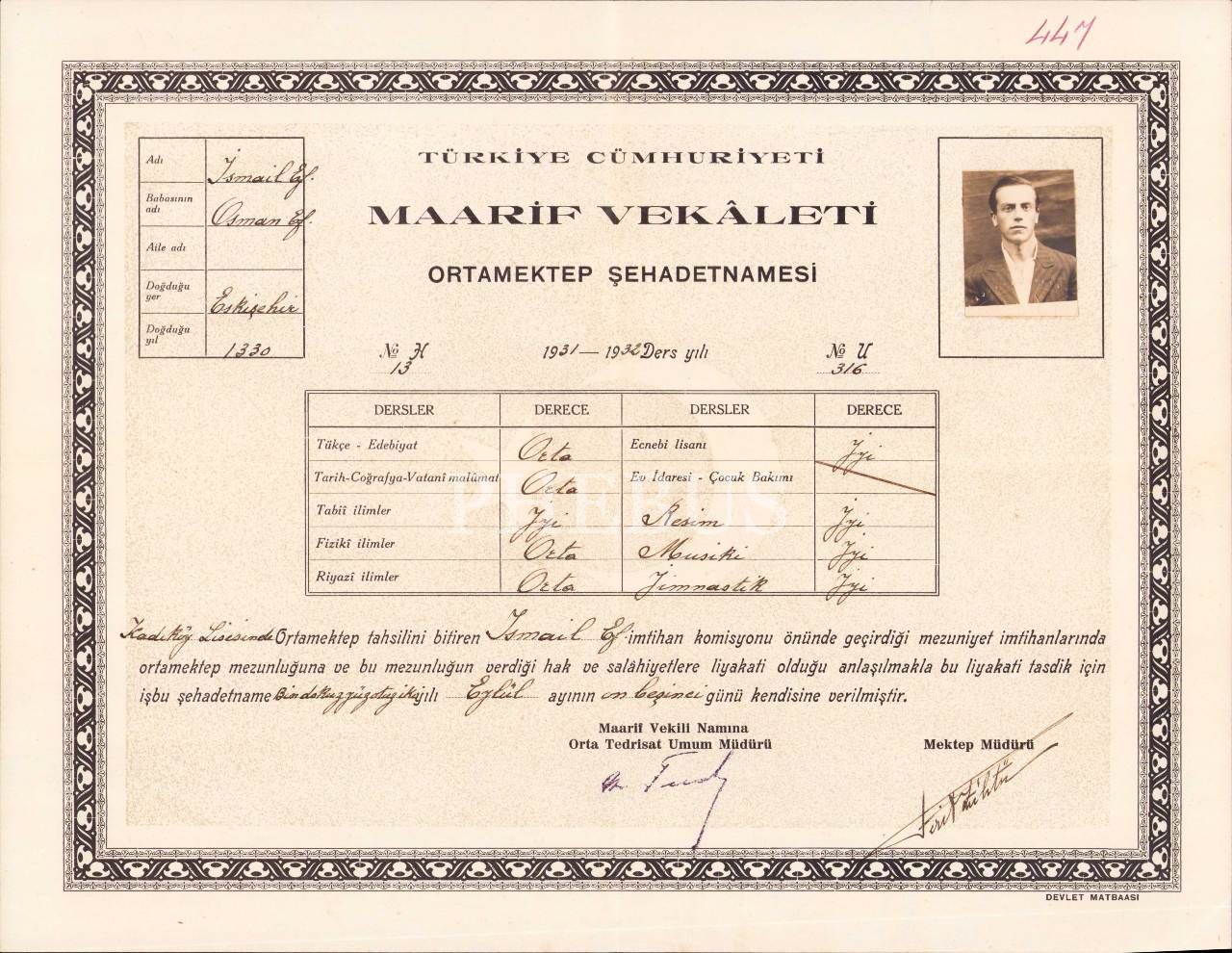 Türkiye Cumhuriyeti Maarif Vekaleti ortaöğretim diploması, Kadıköy Lisesi, 1931-1932 ders yılı, 14x11 cm