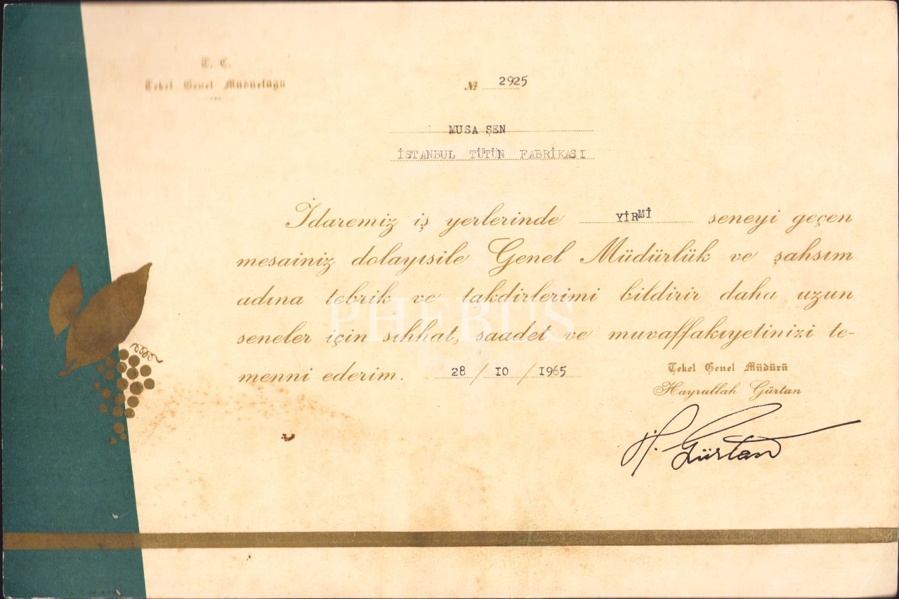 T.C. Tekel Genel Müdürlüğü - İstanbul Tütün Fabrikası antetli, Musa Şen isimli çalışanın 20 seneyi geçen çalışması dolayısıyla gönderilen tebrik belgesi, Tekel Genel Müdürü Hayrullah Gürtan ıslak imzalı, 13x9 cm