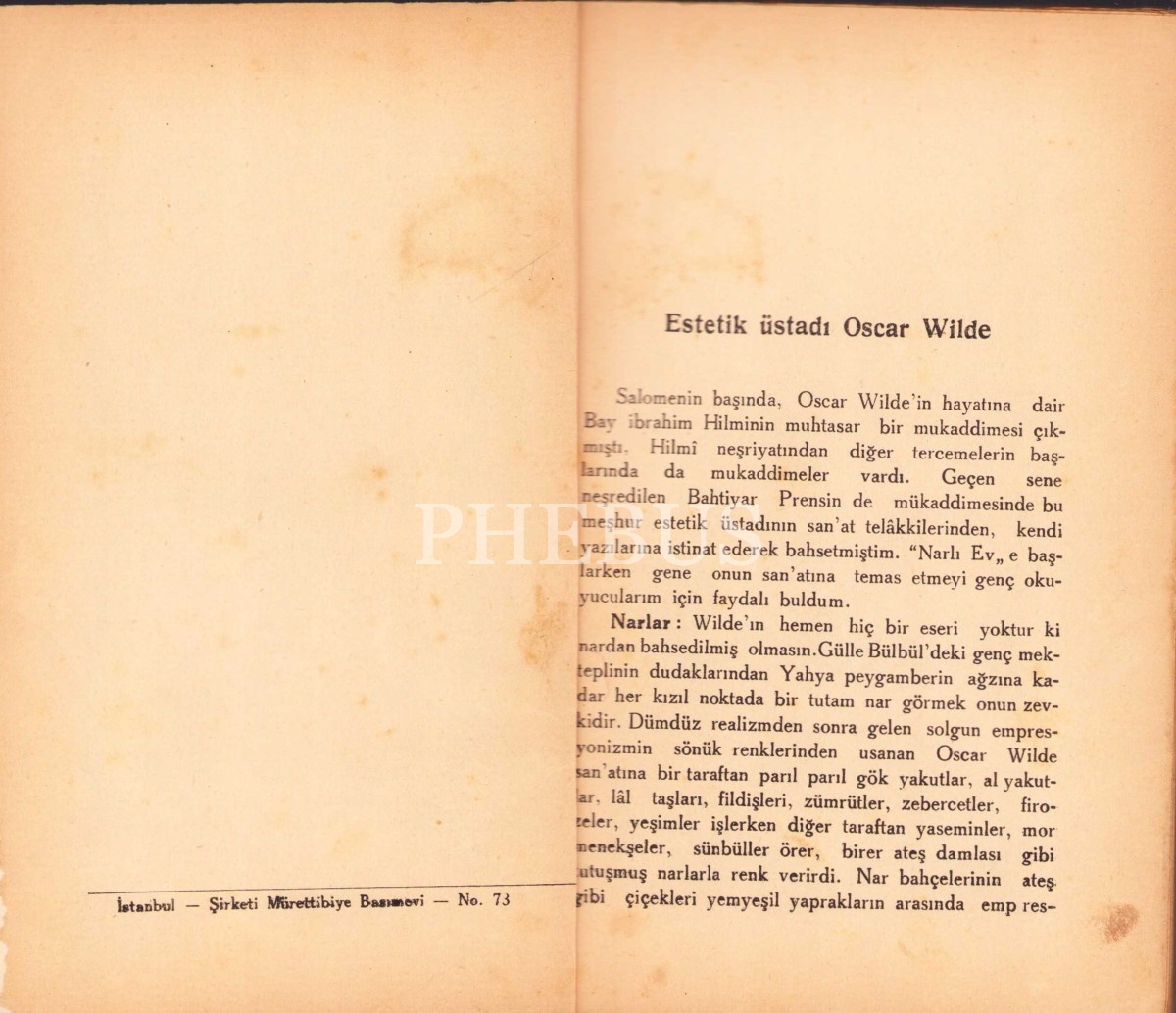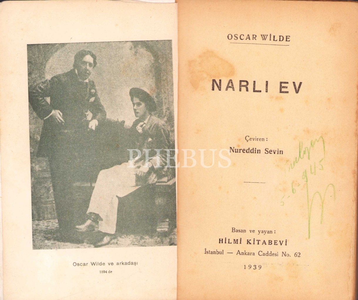 Narlı Ev, Oscar Wilde, Çev.: Nureddin Sevin, Hilmi Kitabevi, İstanbul 1939, 118 syf., 12x18 cm, kapağın üst kısmı yırtık